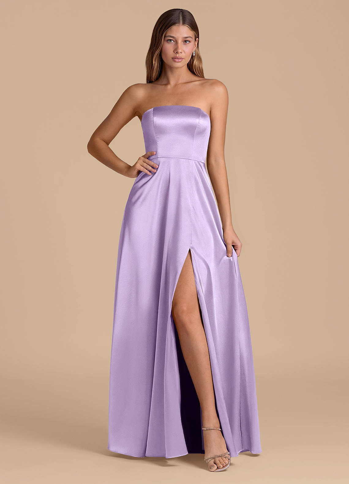A라인 스트랩리스 메탈릭 새틴 바닥 길이 드레스