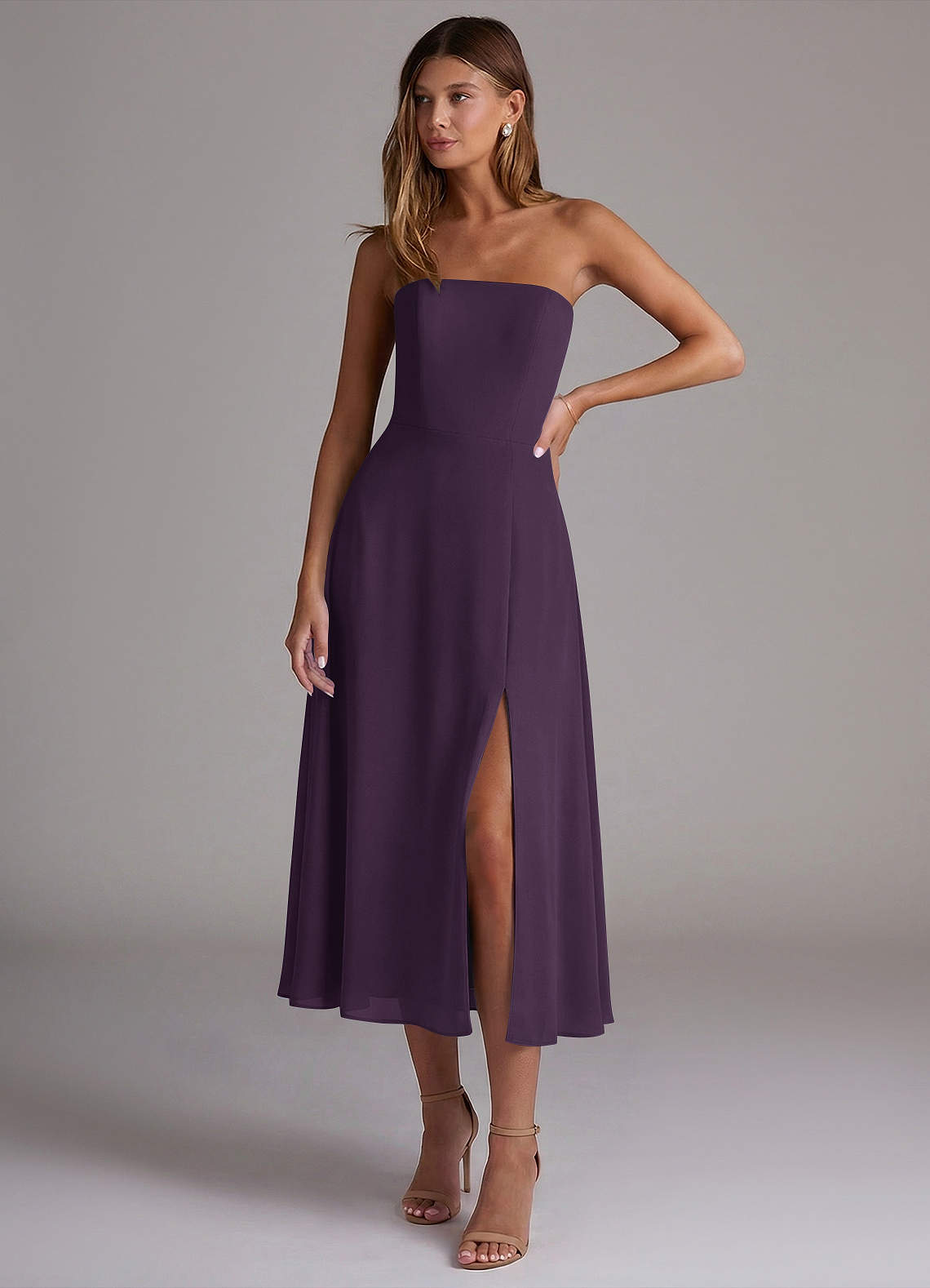 A라인 스트랩리스 쉬폰 티 길이 드레스