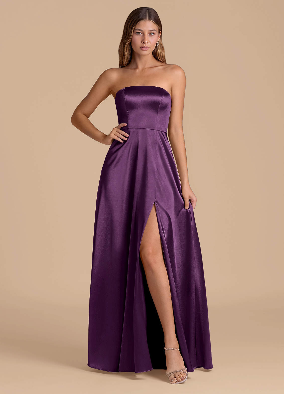 A라인 스트랩리스 메탈릭 새틴 바닥 길이 드레스