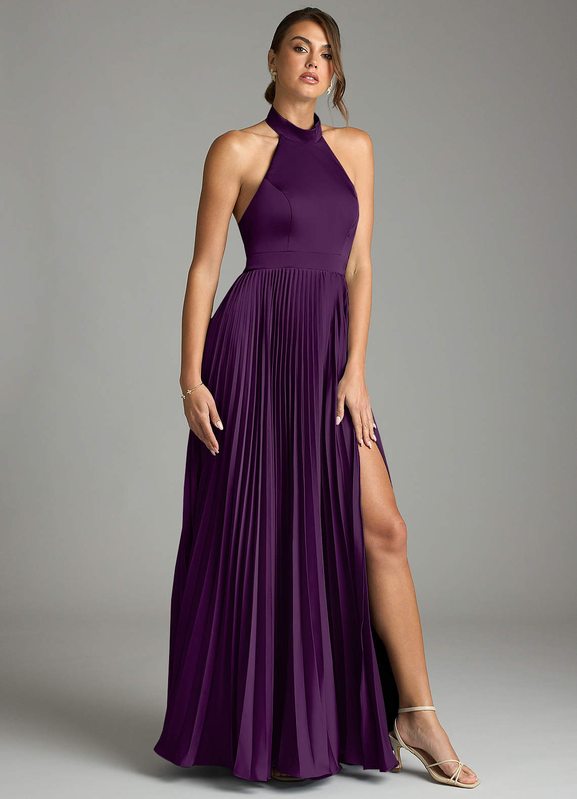 A라인 주름진 스트레치 새틴 바닥 길이 드레스