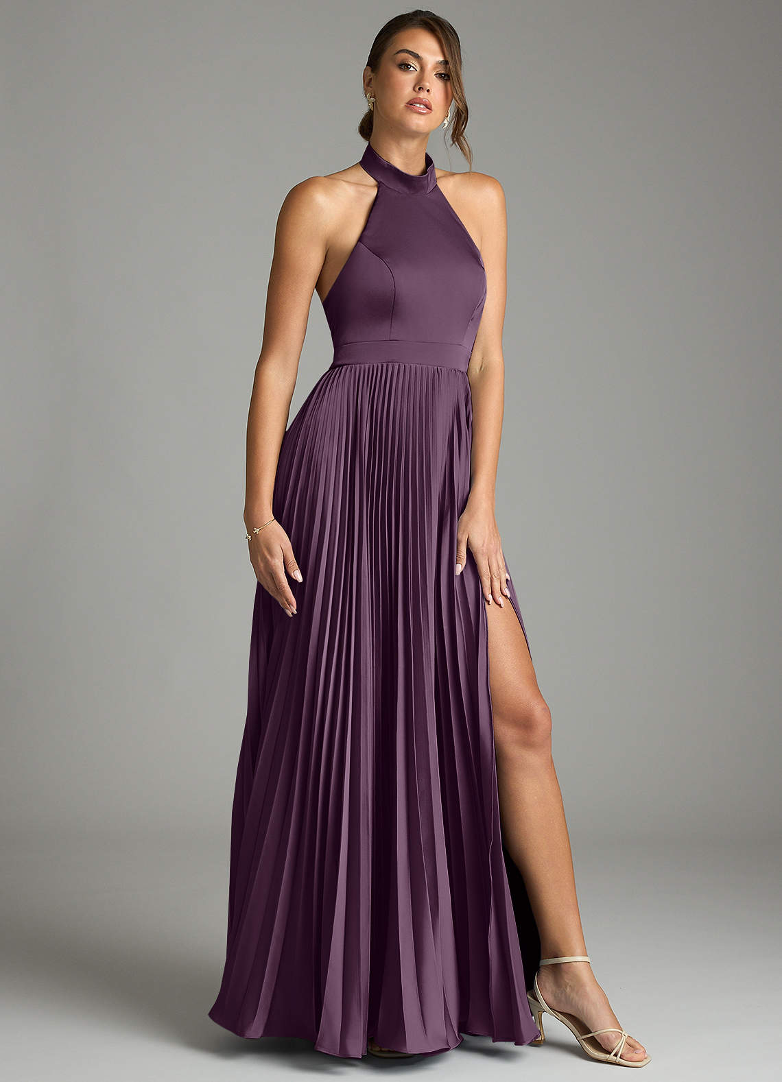A라인 주름진 스트레치 새틴 바닥 길이 드레스