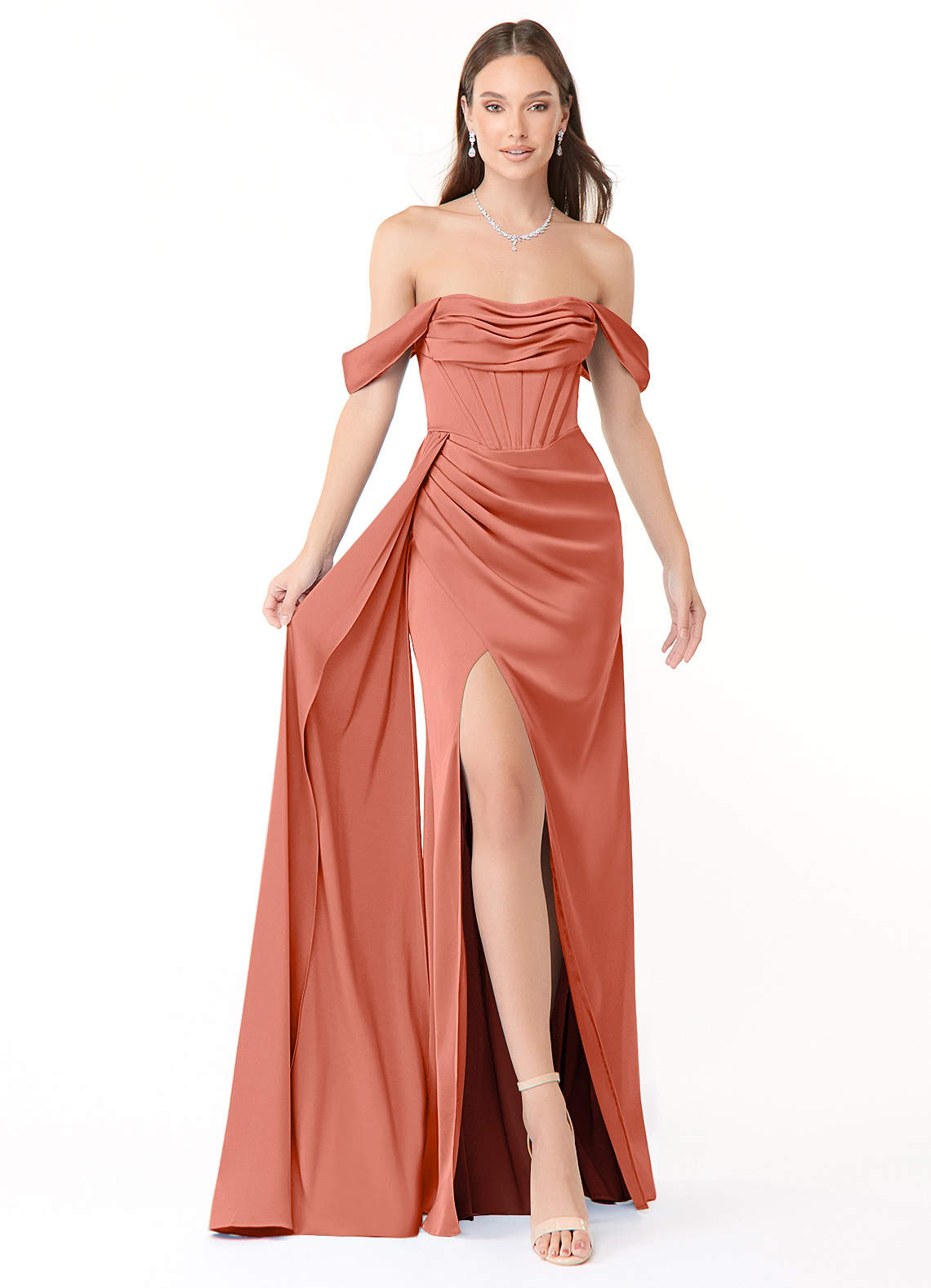 Converteerbaar Jurk van Stretch Satijn met Zeemeermin Off the Shoulder Zalm Roze