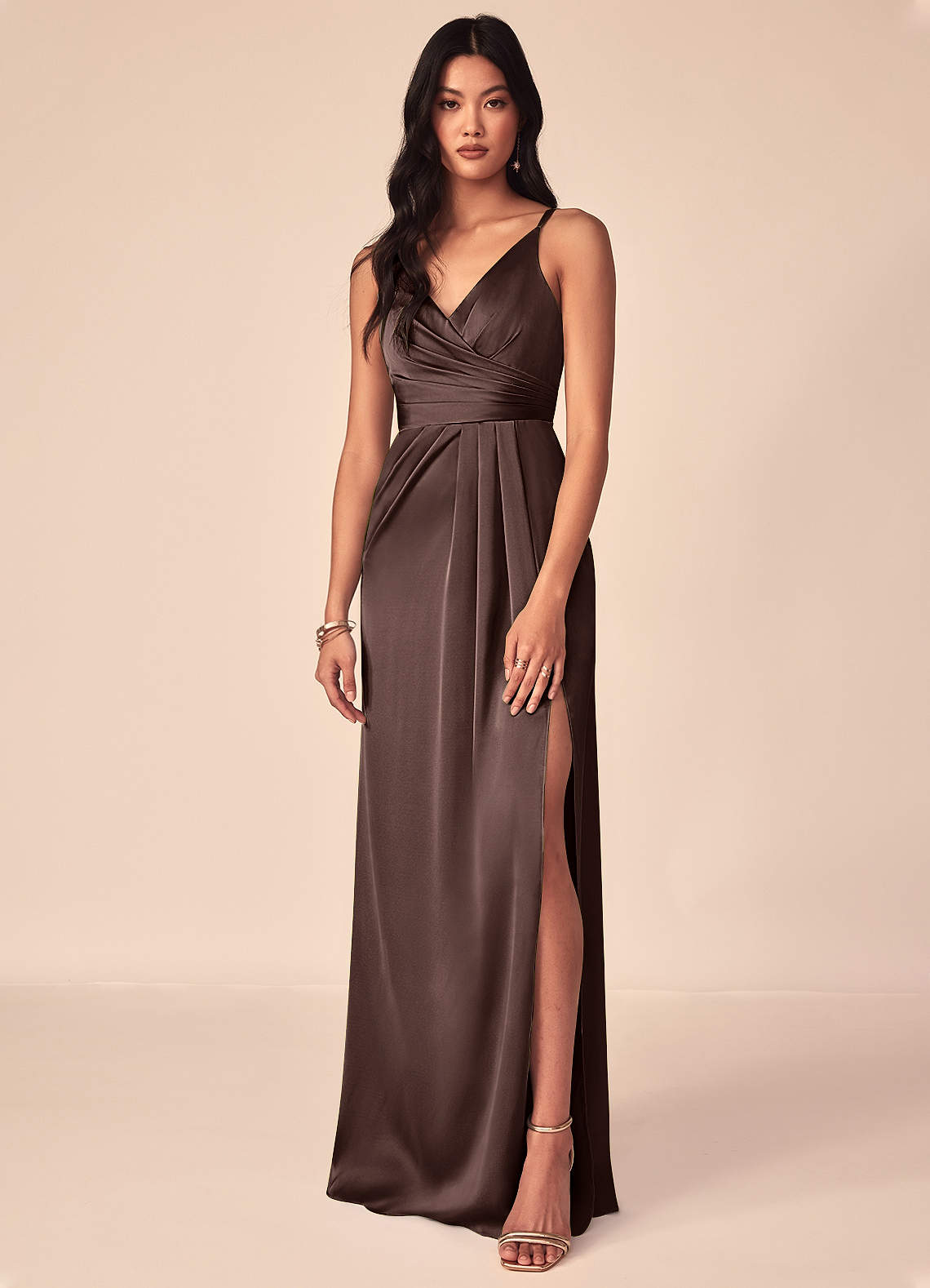 Jurk van Stretch Satijn met A-Lijn V-hals geplooid Ganache