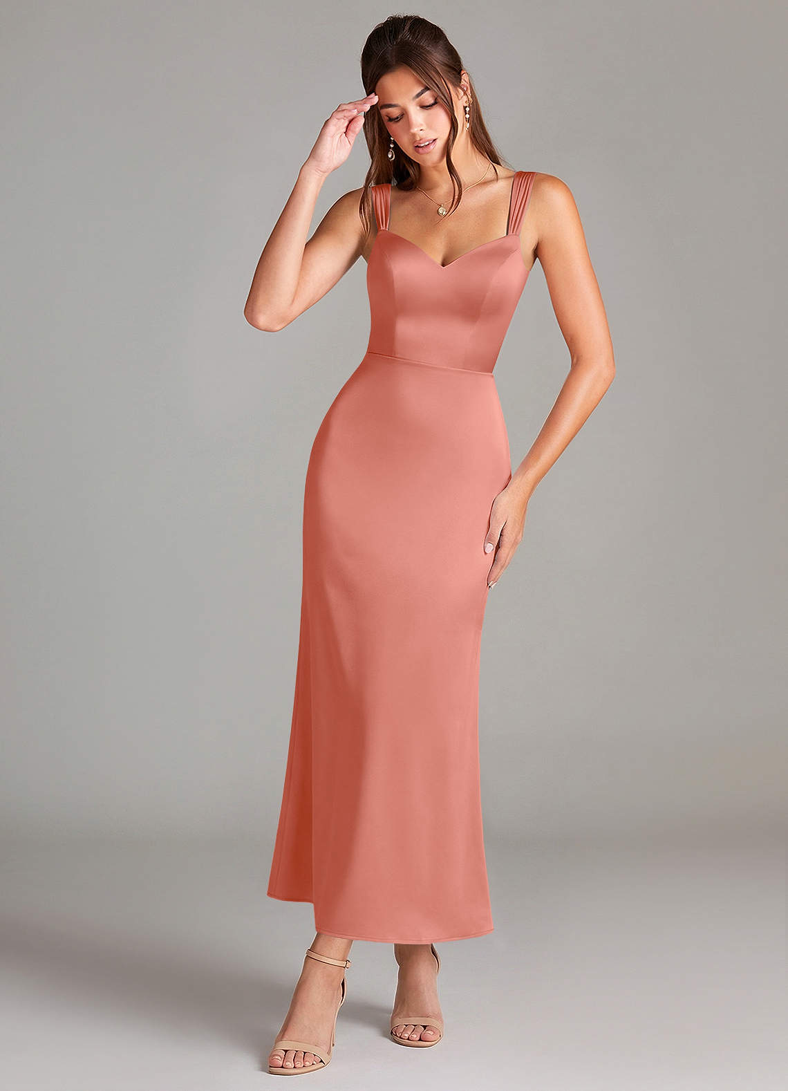 Jurk van Stretch Satijn met Kolom Geplooid Zalm Roze