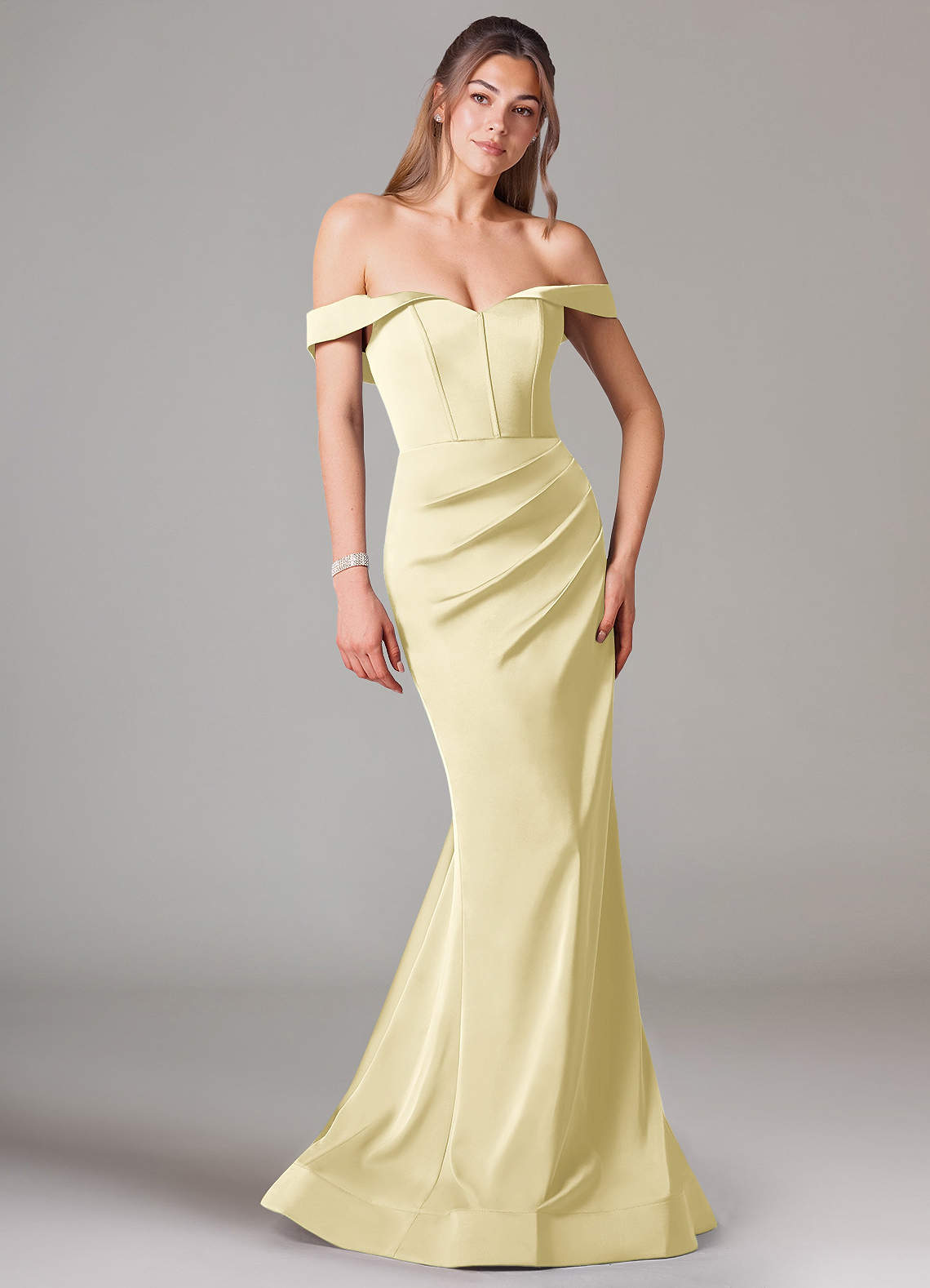 Converteerbaar Jurk van Stretch Satijn met Zeemeermin Off the Shoulder Citroensorbet