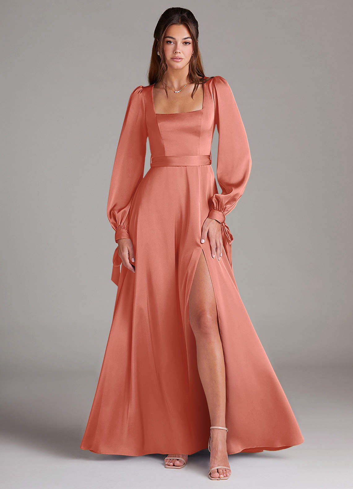 Jurk van Stretch Satijn met A-Lijn Lange mouw Zalm Roze