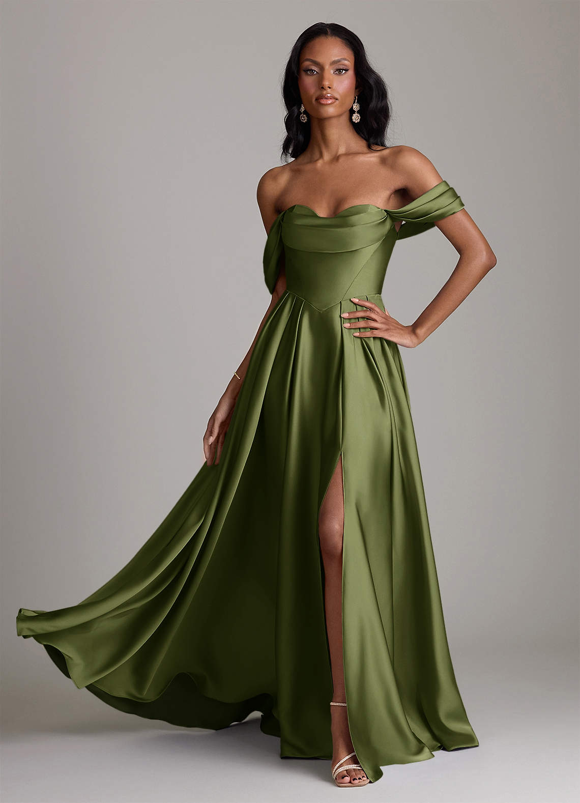 Jurk van Stretch Satijn met A-Lijn Off the Shoulder Olijf