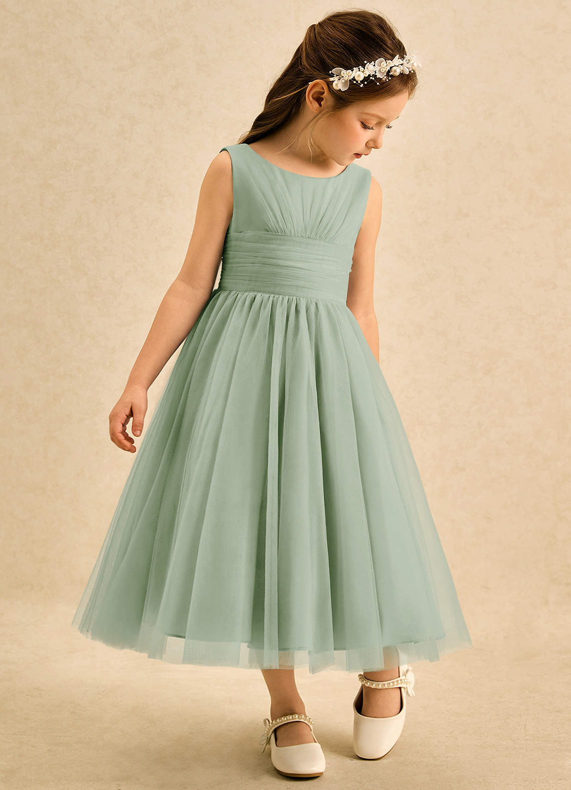 A-Lijn Jurk van Tule Geplooid Stoffige Salie