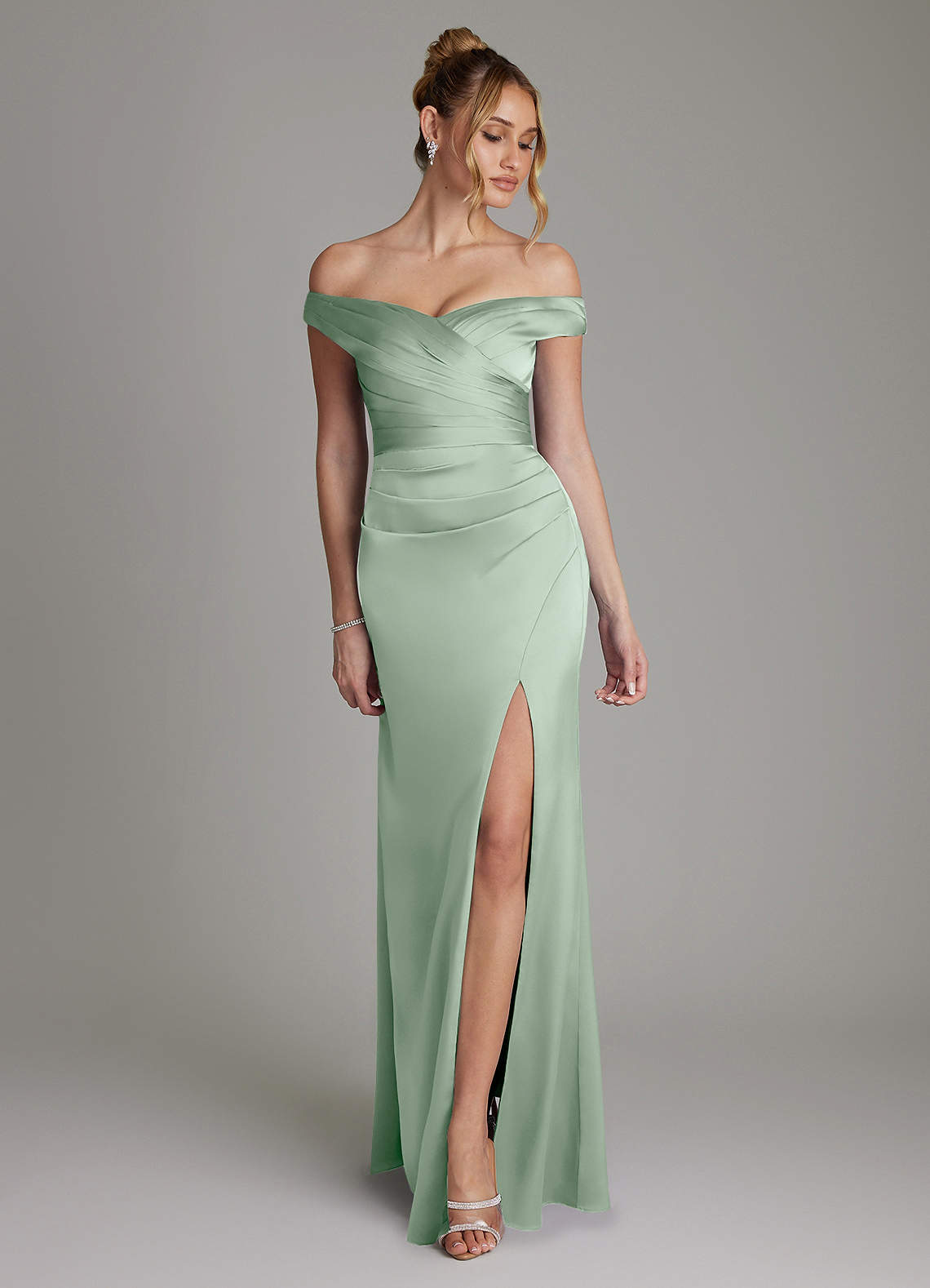 Jurk van Stretch Satijn met Kolom Off the Shoulder Agave