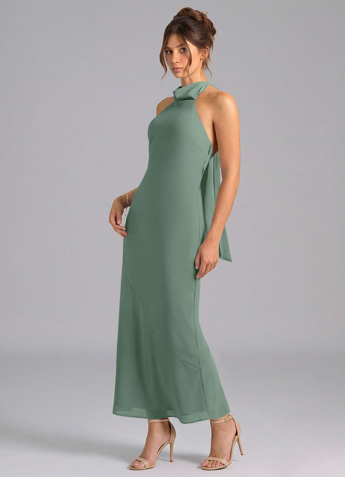 Jurk van Chiffon met Zeemeermin Hoge Kraag Eucalyptus