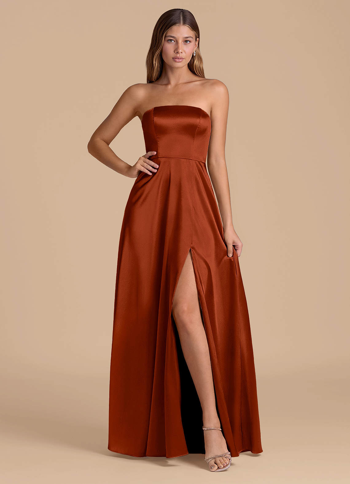 Jurk van Metaalachtig Satijn met A-Lijn Strapless Kastanjebruin