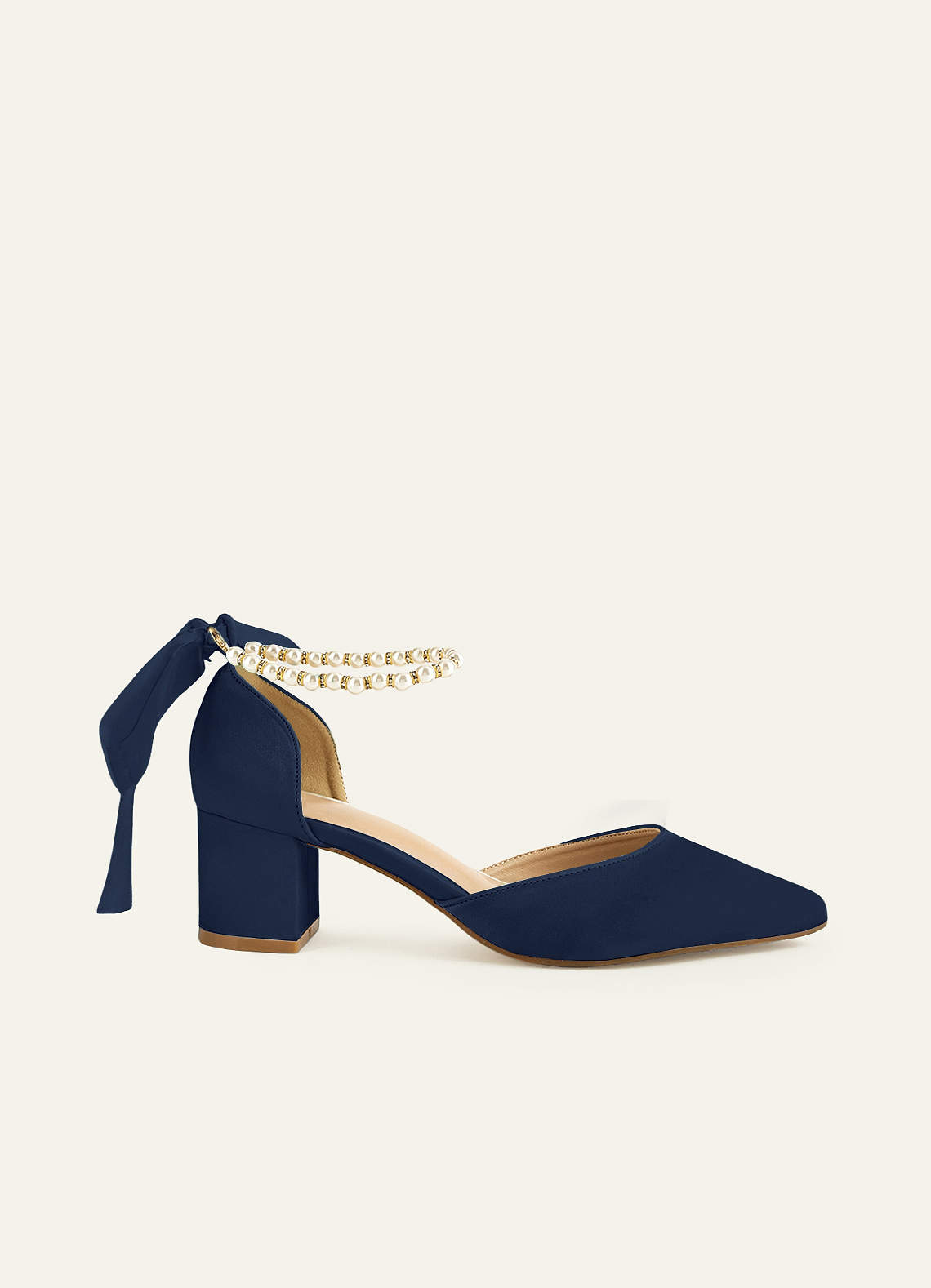 Bijpassende kleur matte satijnen parel en strik puntige neus blokhakken