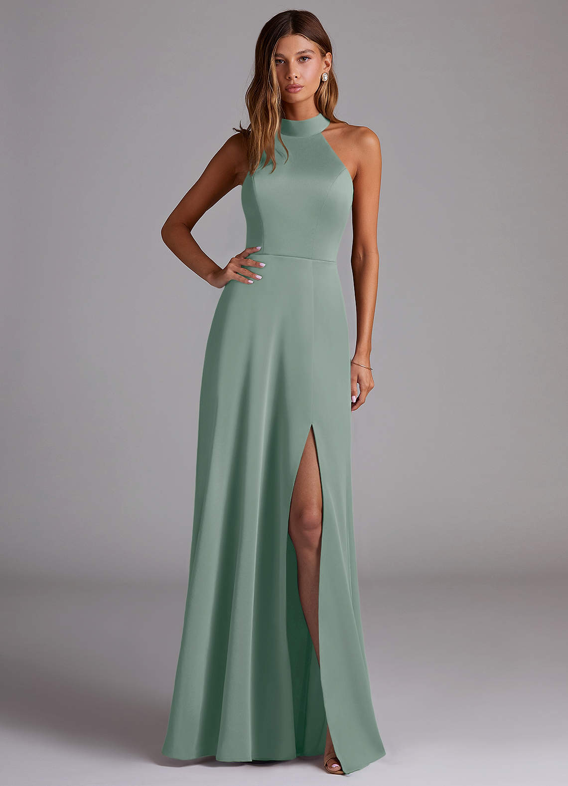 Jurk van Stretch Satijn met A-Lijn Hoge Kraag Agave