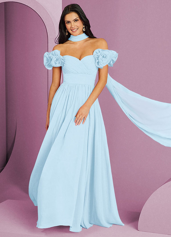 Rozkloszowana szyfonowa sukienka z odkrytymi ramionami i kwiatowymi rozetkami