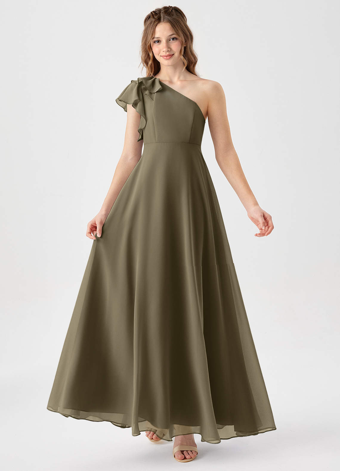 Linia A Marszczony Szyfon Długość podłogi Młodsza druhna Sukienka