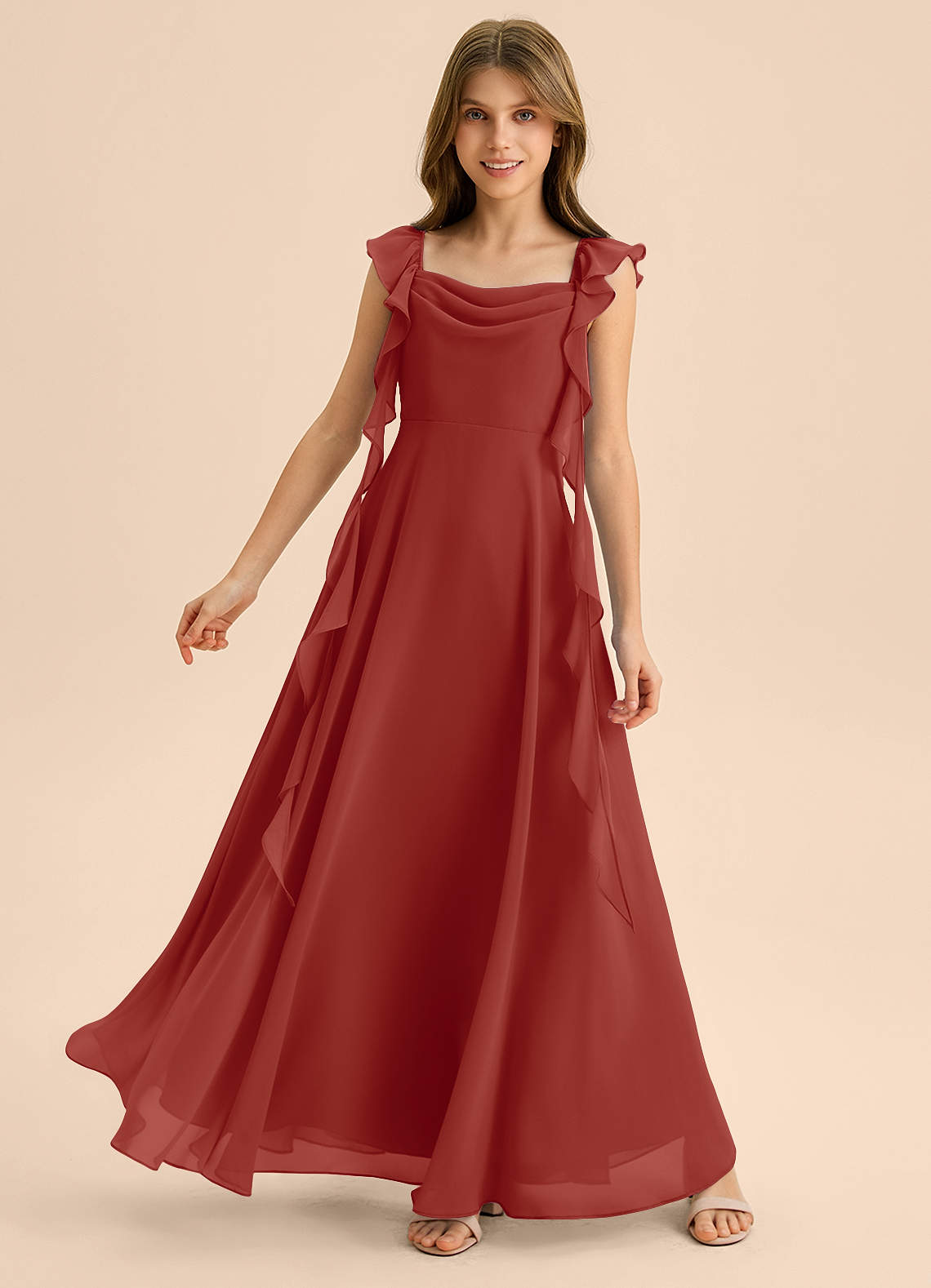 Linia A Marszczony Szyfon Długość podłogi Młodsza druhna Sukienka