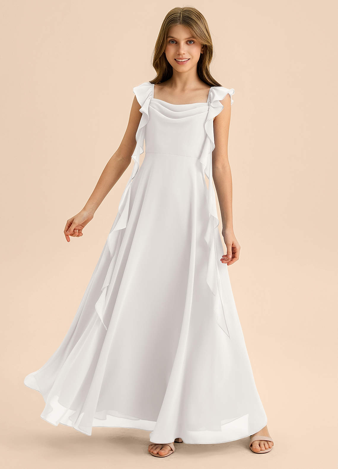 Linia A Marszczony Szyfon Długość podłogi Młodsza druhna Sukienka