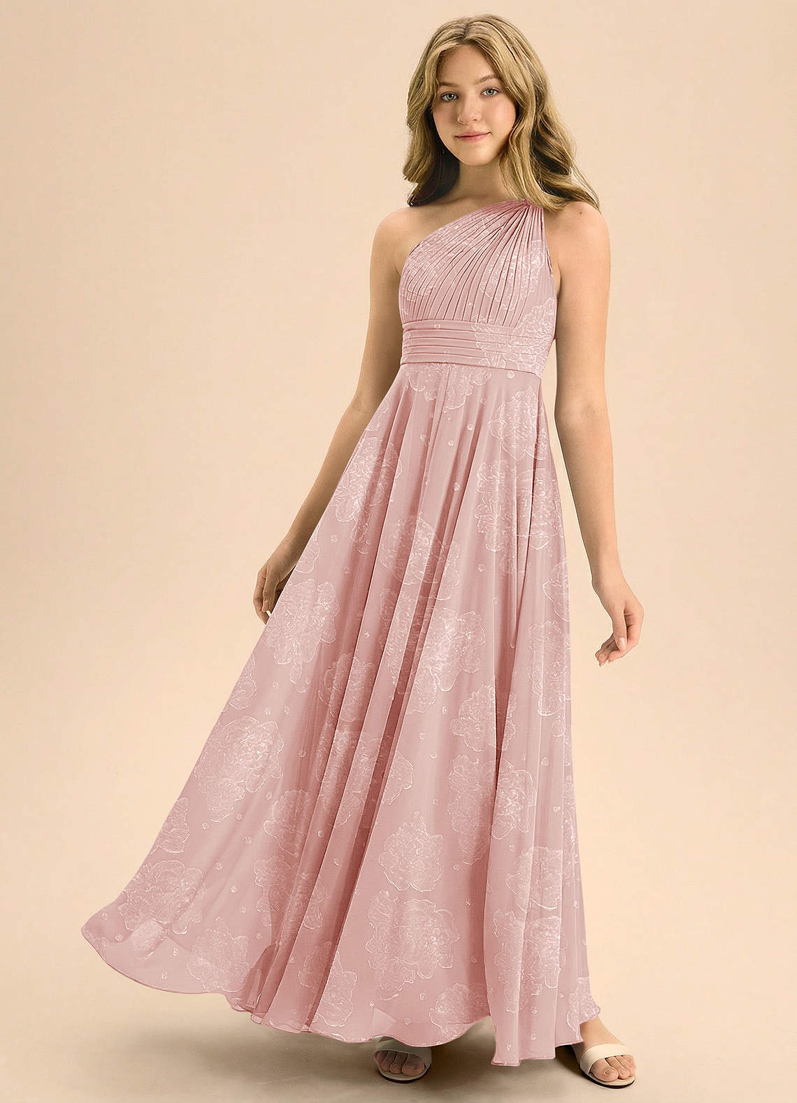 Linia A Pofałdowany Kwiatowe wypalenie Długość podłogi Młodsza druhna Sukienka
