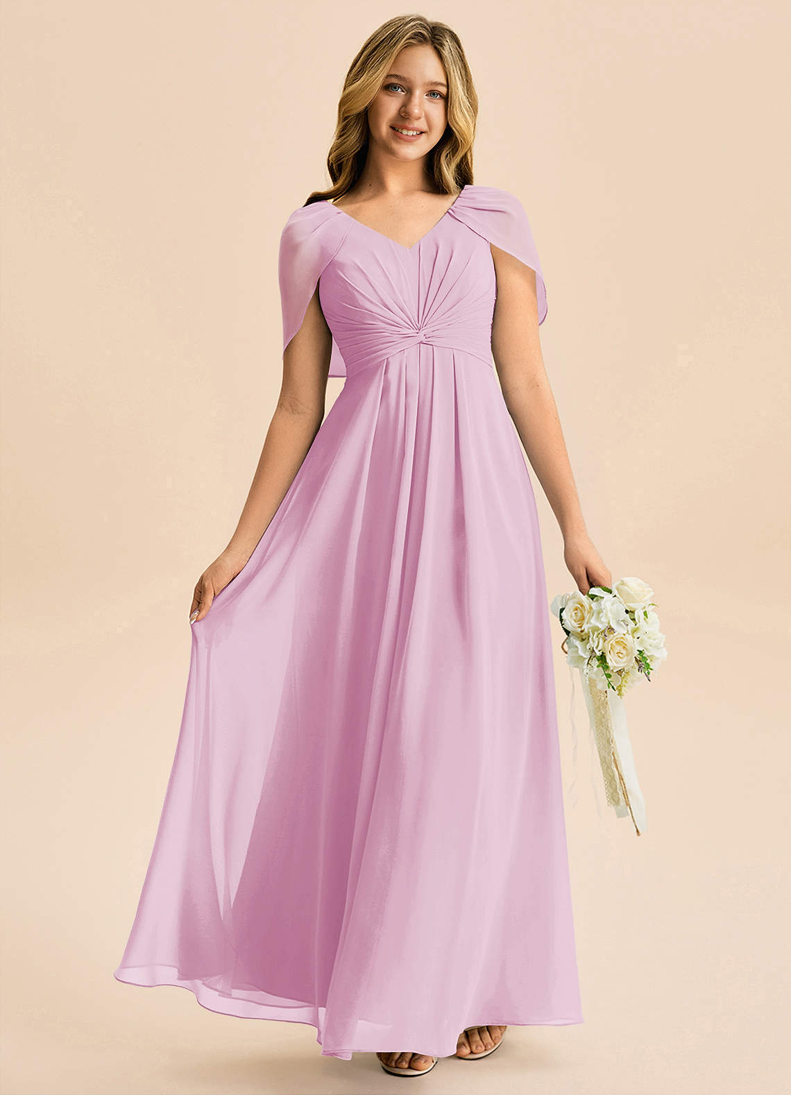 Linia A Pofałdowany Szyfon Długość podłogi Młodsza druhna Sukienka