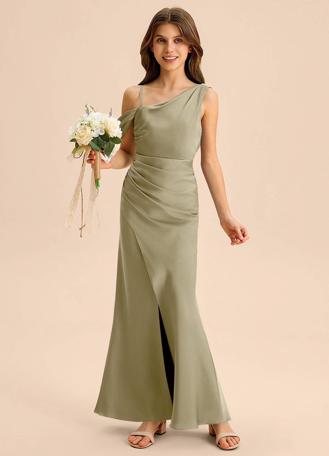 Osłona Zza ramienia Satyna elastyczna Długość podłogi Młodsza druhna Sukienka