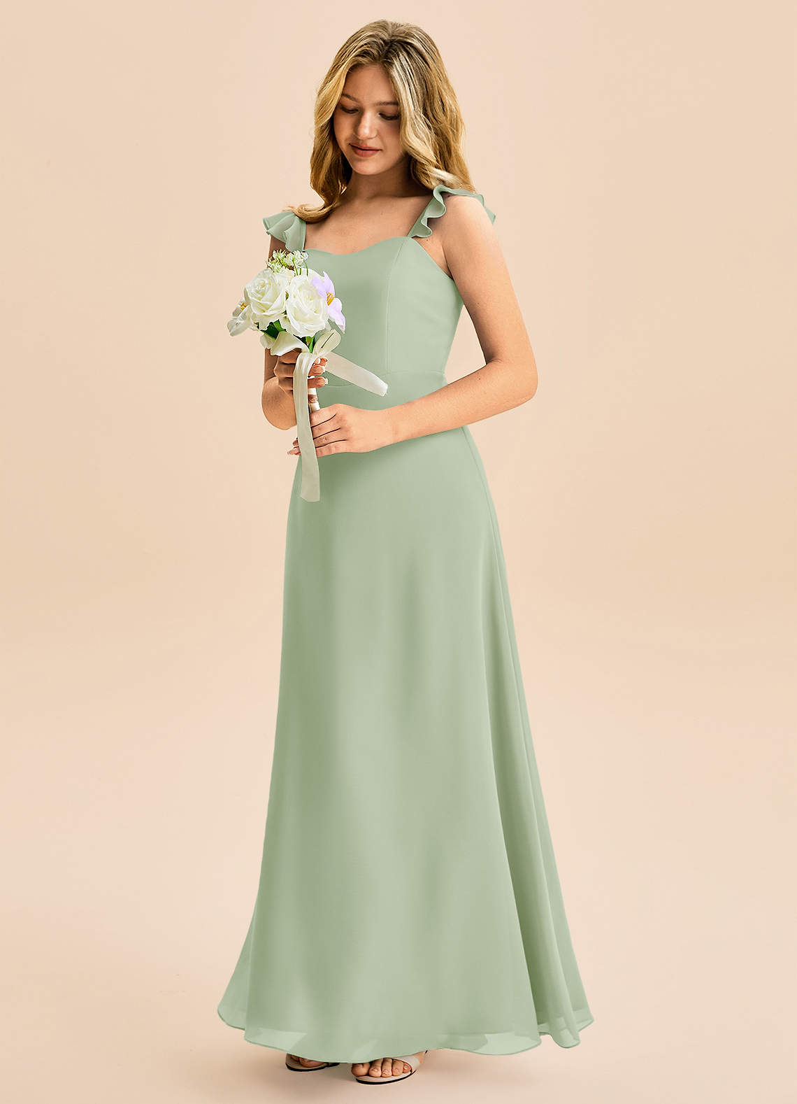Linia A Marszczony Szyfon Długość podłogi Młodsza druhna Sukienka