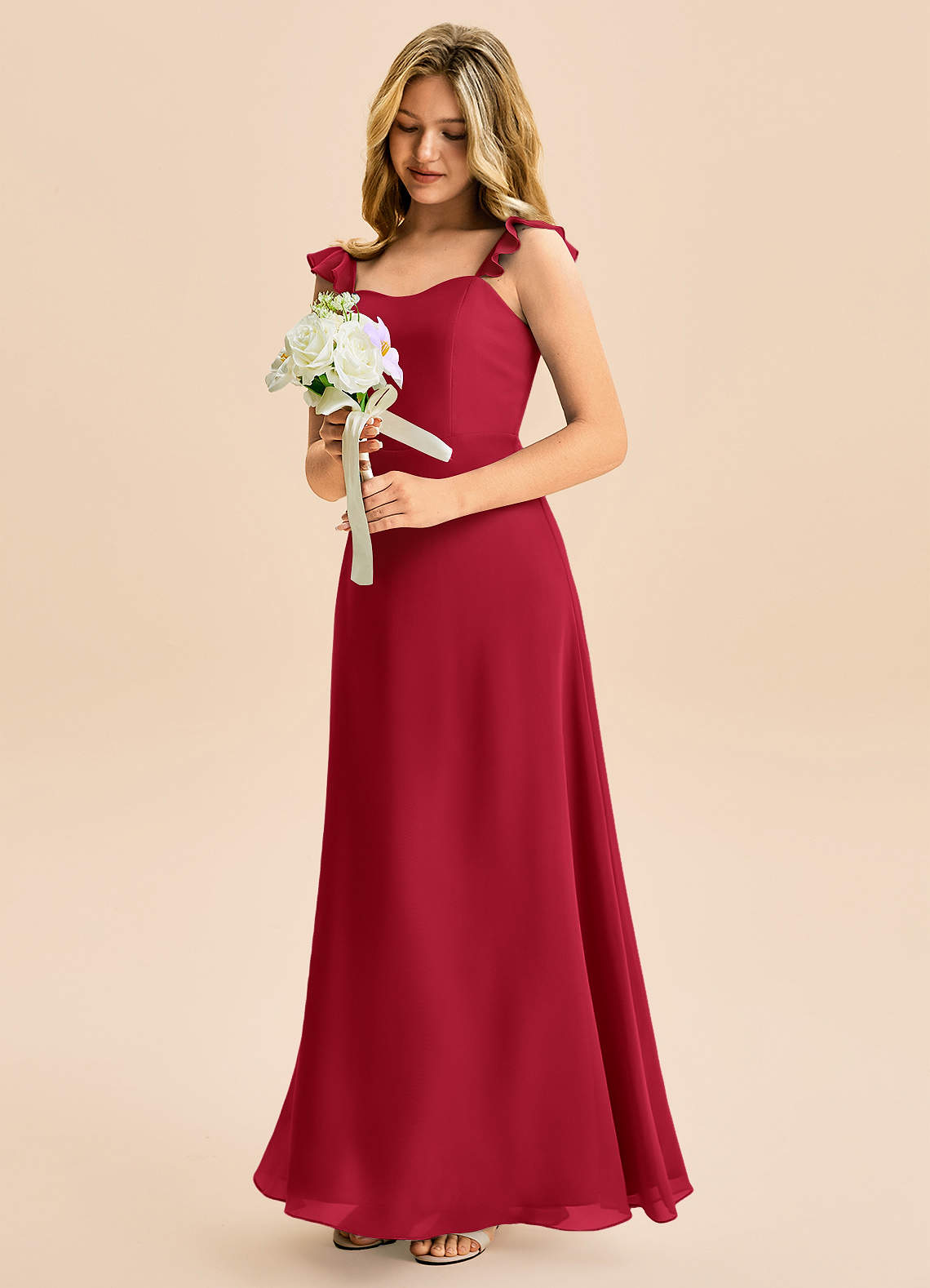 Linia A Marszczony Szyfon Długość podłogi Młodsza druhna Sukienka