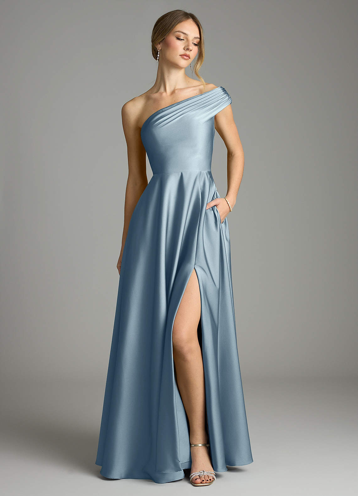 Linia A Zza ramienia Satyna elastyczna Do ziemi Sukienka