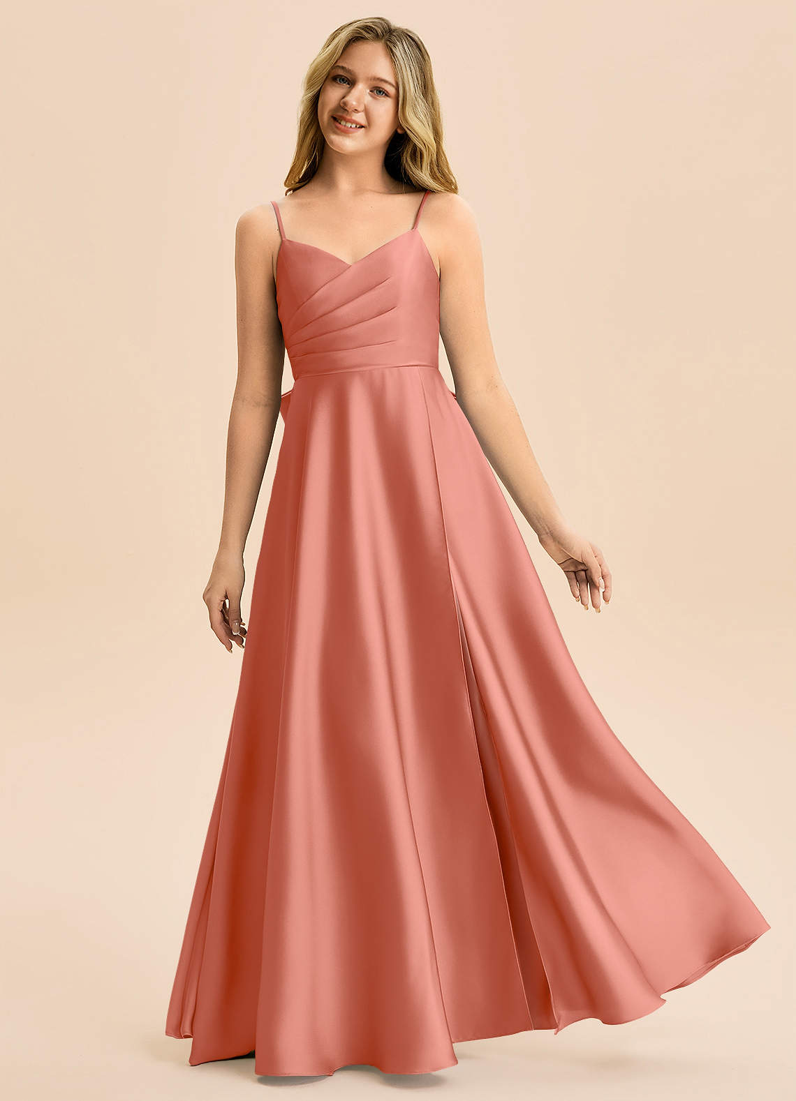 Linia A Pofałdowany Satyna elastyczna Długość podłogi Młodsza druhna Sukienka