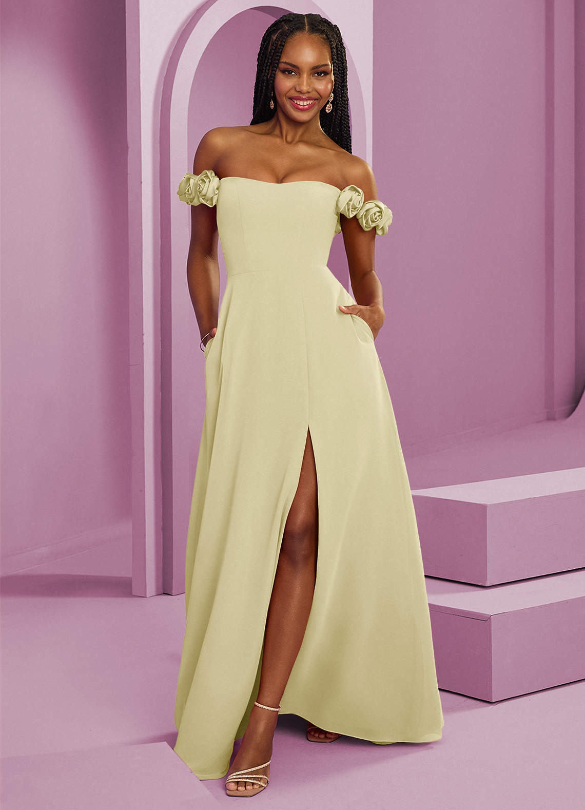 Rozkloszowana szyfonowa sukienka z odkrytymi ramionami i kwiatowymi rozetkami Sorbet cytrynowy