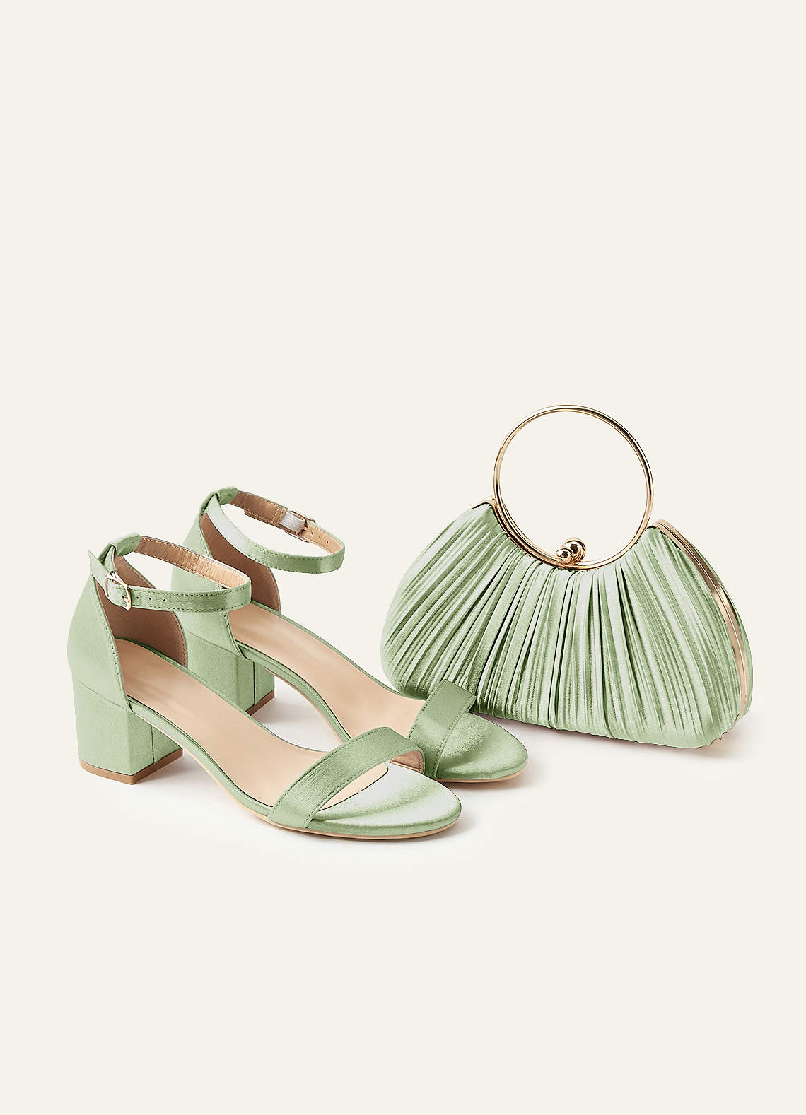 Zestaw metalicznych, satynowych sandałów na niskim obcasie w pasującym kolorze z plisowaną torebką