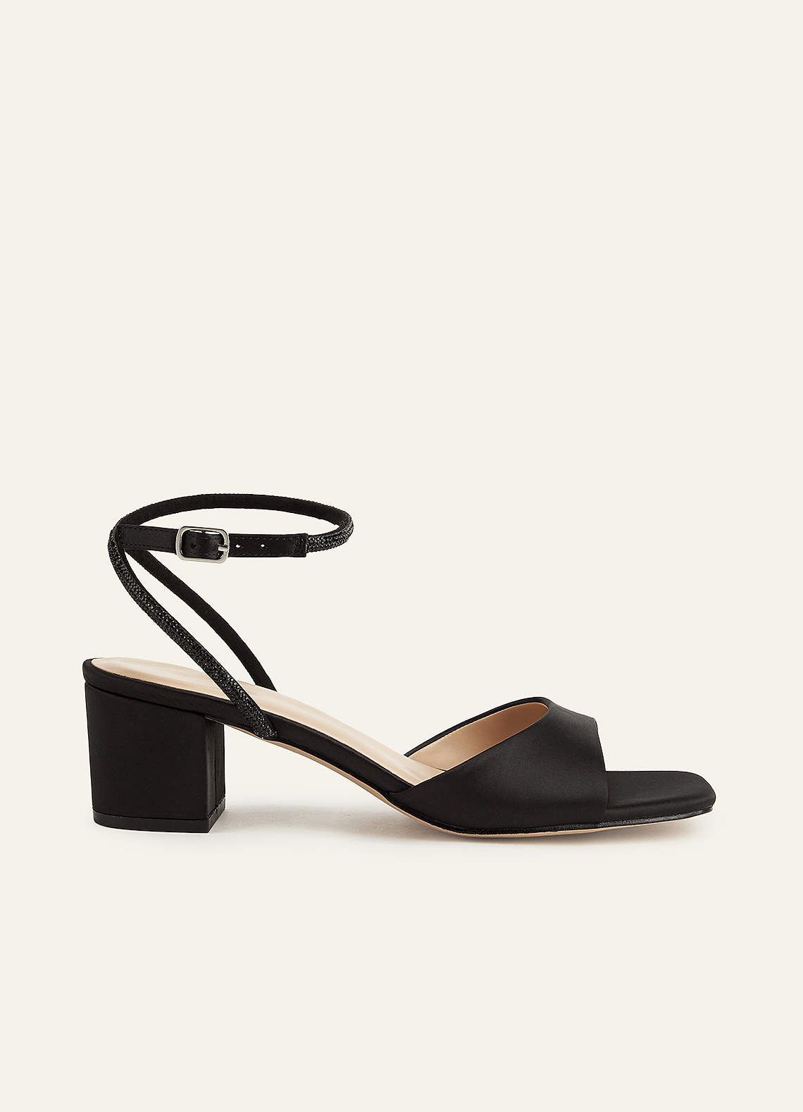 Metaliczne satynowe buty na obcasie typu block z paskiem na kostce i zdobione kryształkami