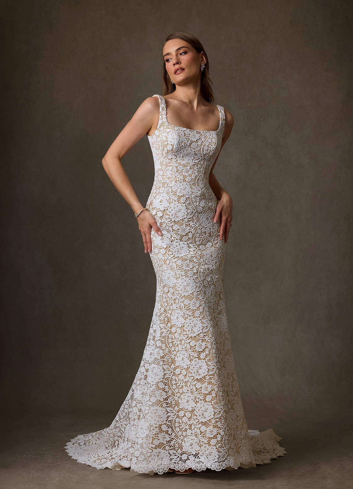 Diamond White Nude Mermaid Square Neckline Lace Dress