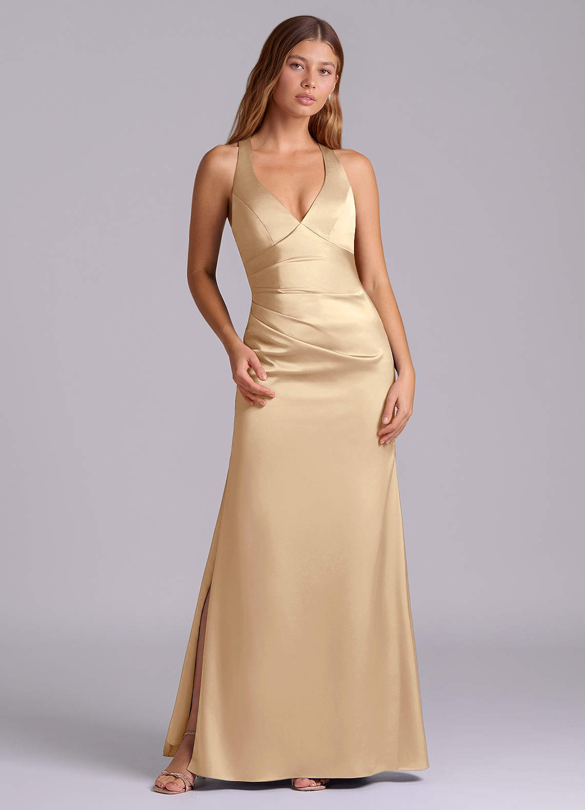 Champagne A-Line Pleated Stretch Satin Dress
