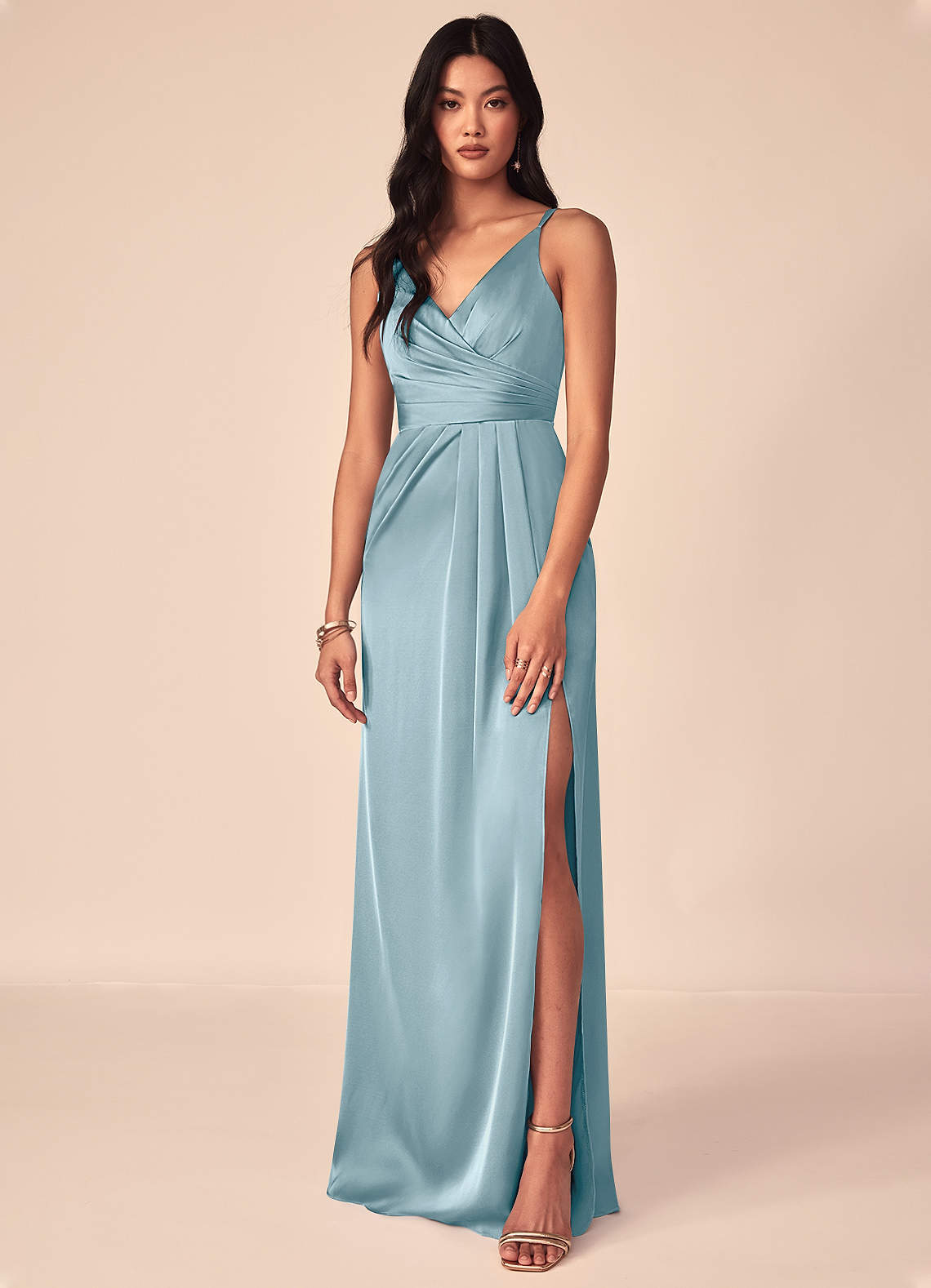 Moody Blue A-Line V-Neck Pleated Stretch Satin Dress