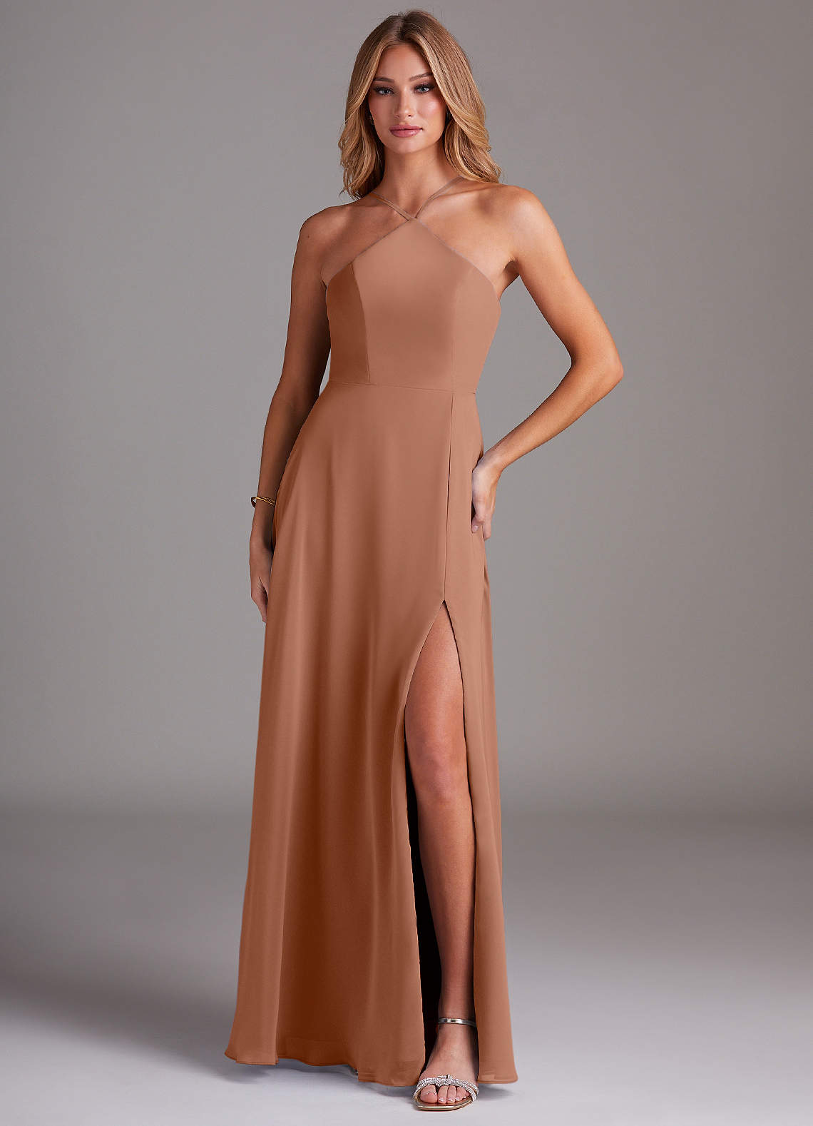 Azazie Bailey Bridesmaid Dresses Bronzer A-Line Halter Side Slit Chiffon Dress image1