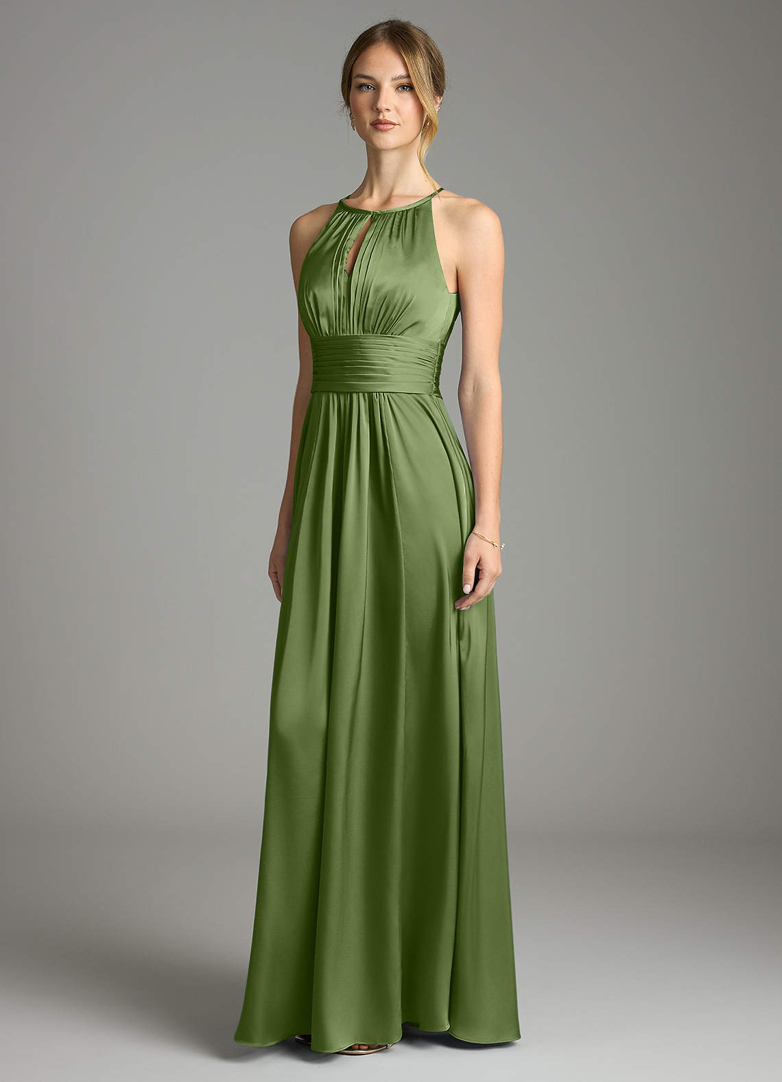 Azazie Bonnie Bridesmaid Dresses Juniper A-Line Pleated Stretch Satin Dress image1