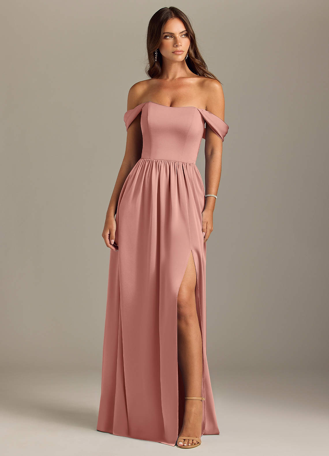 Rosette A-Line Off the Shoulder Stretch Satin Convertible Dress