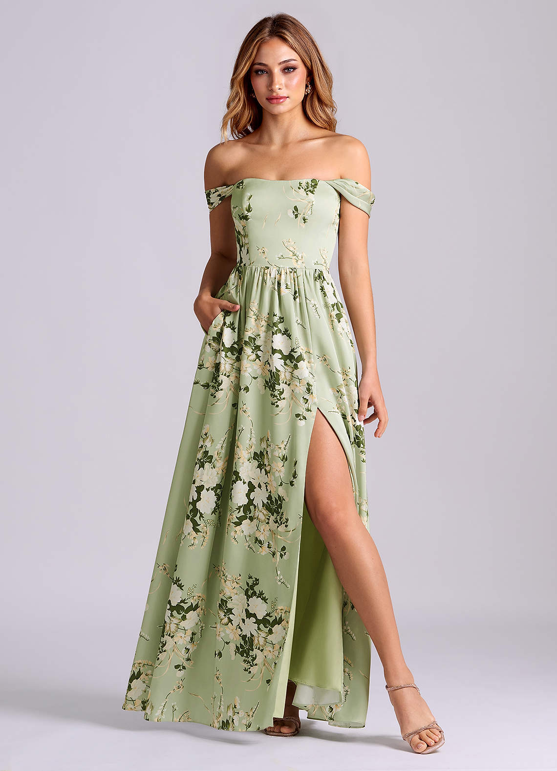 Floral Vines A-Line Off the Shoulder Stretch Satin Convertible Dress