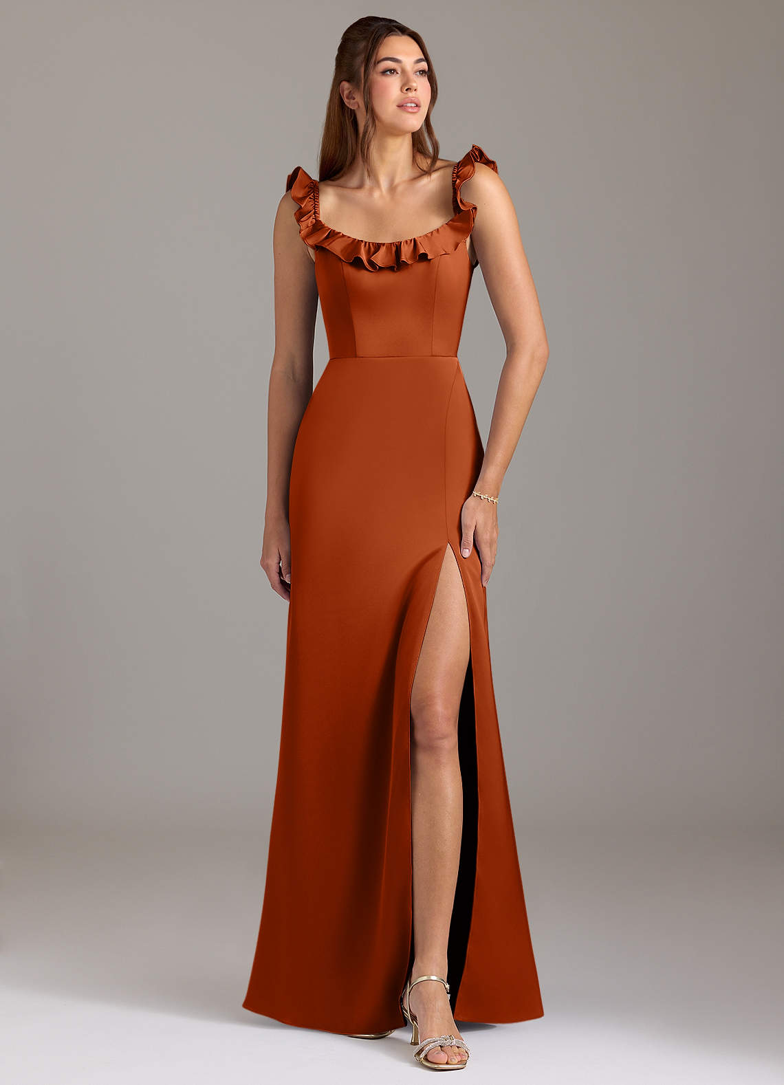 Burnt Orange A-Line Ruched Stretch Satin Convertible Dress