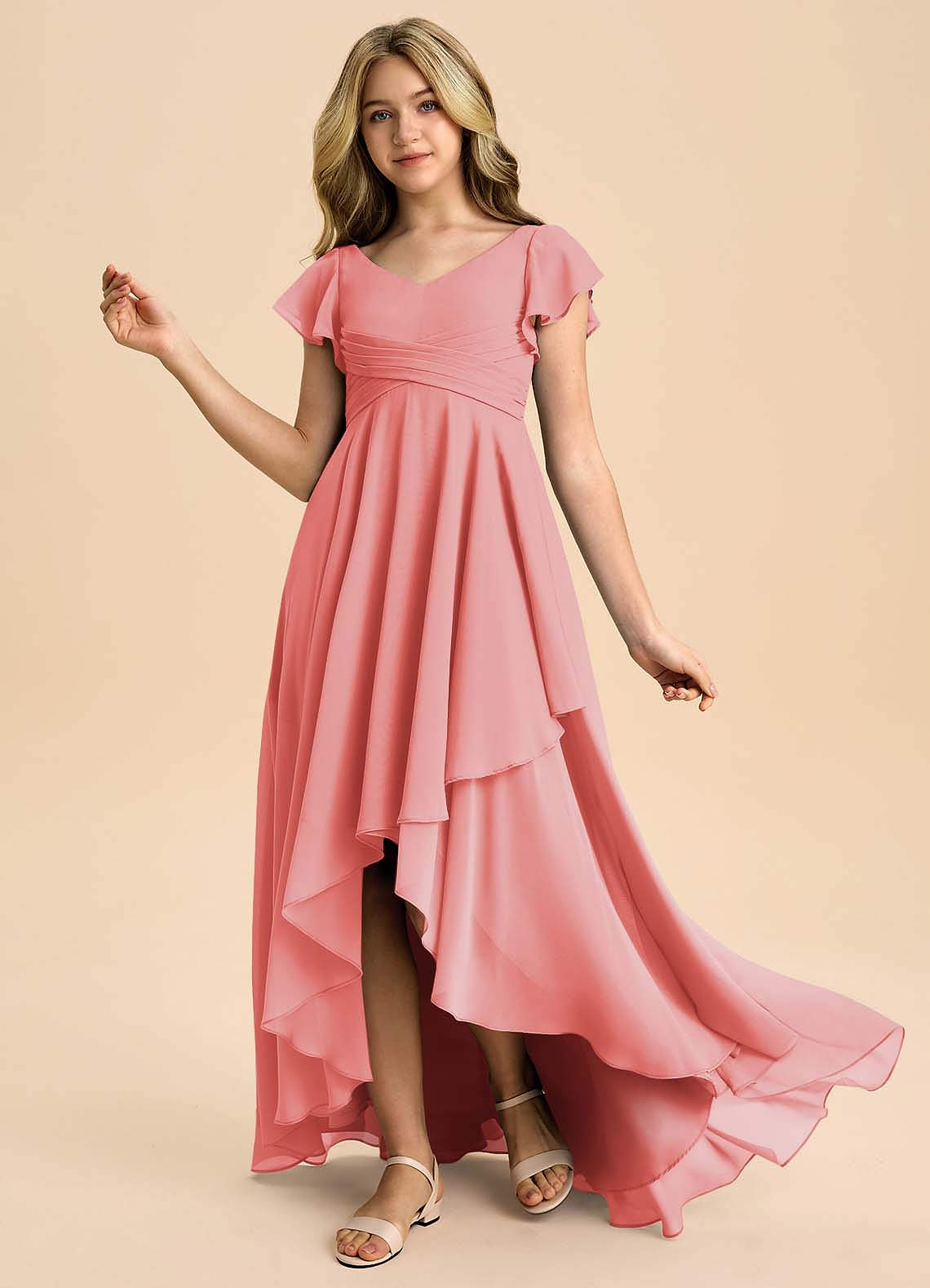 Coral A-Line Pleated Chiffon Dress