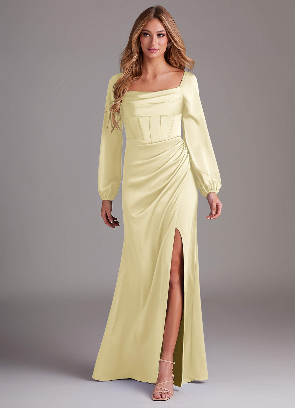 Lemon Sorbet Sheath Long Sleeve Stretch Satin Dress