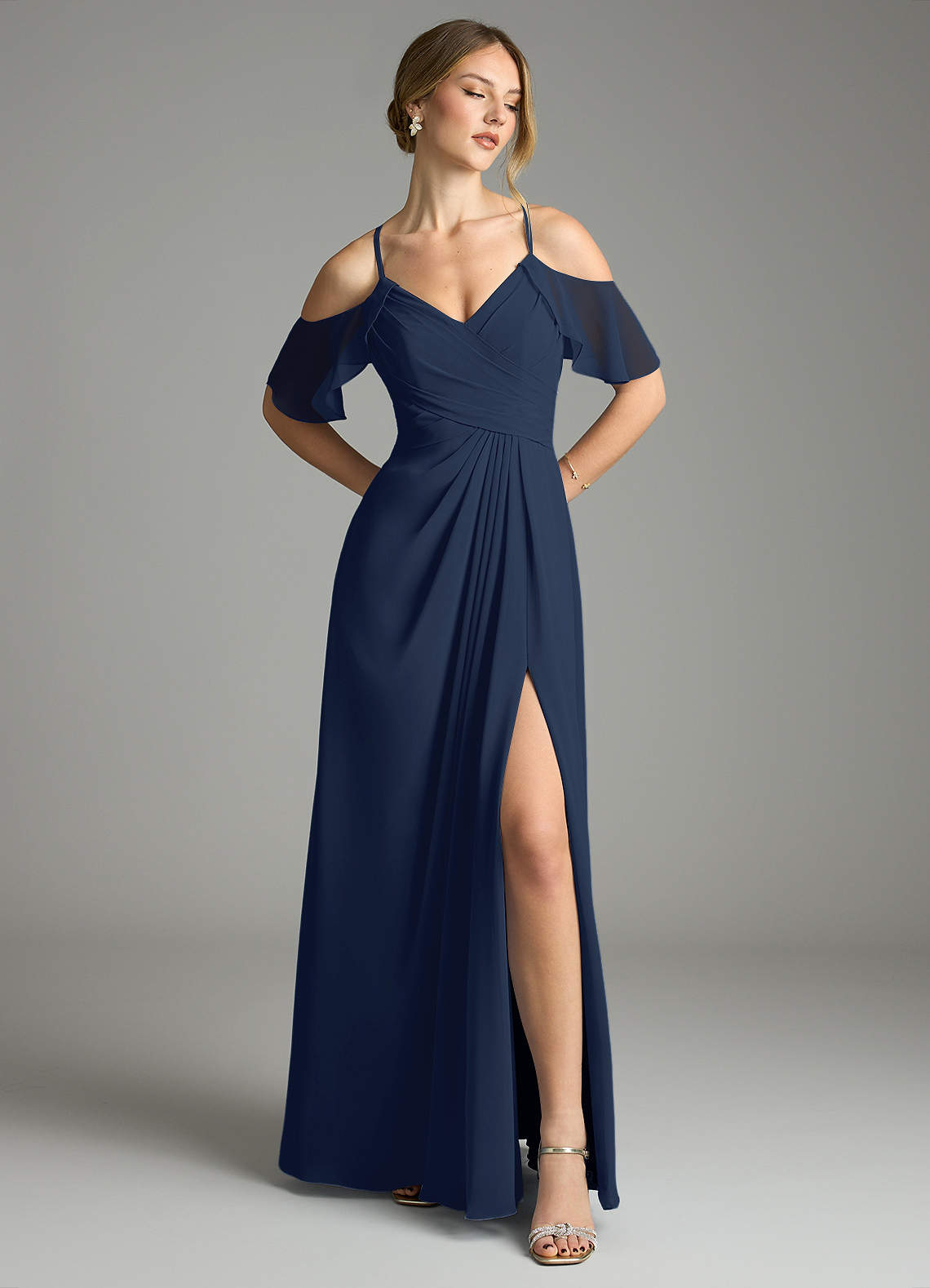 Dark Navy A-Line V-Neck Pleated Chiffon Dress