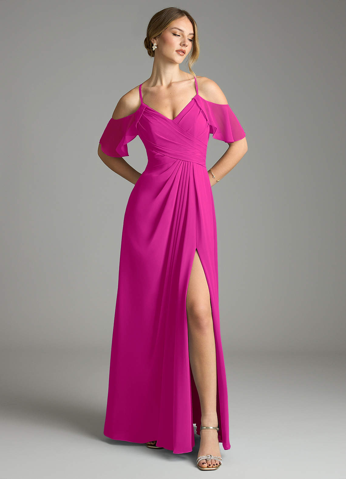 Fuchsia A-Line V-Neck Pleated Chiffon Dress