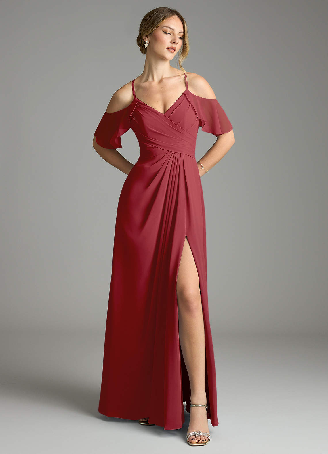 Pomegranate A-Line V-Neck Pleated Chiffon Dress