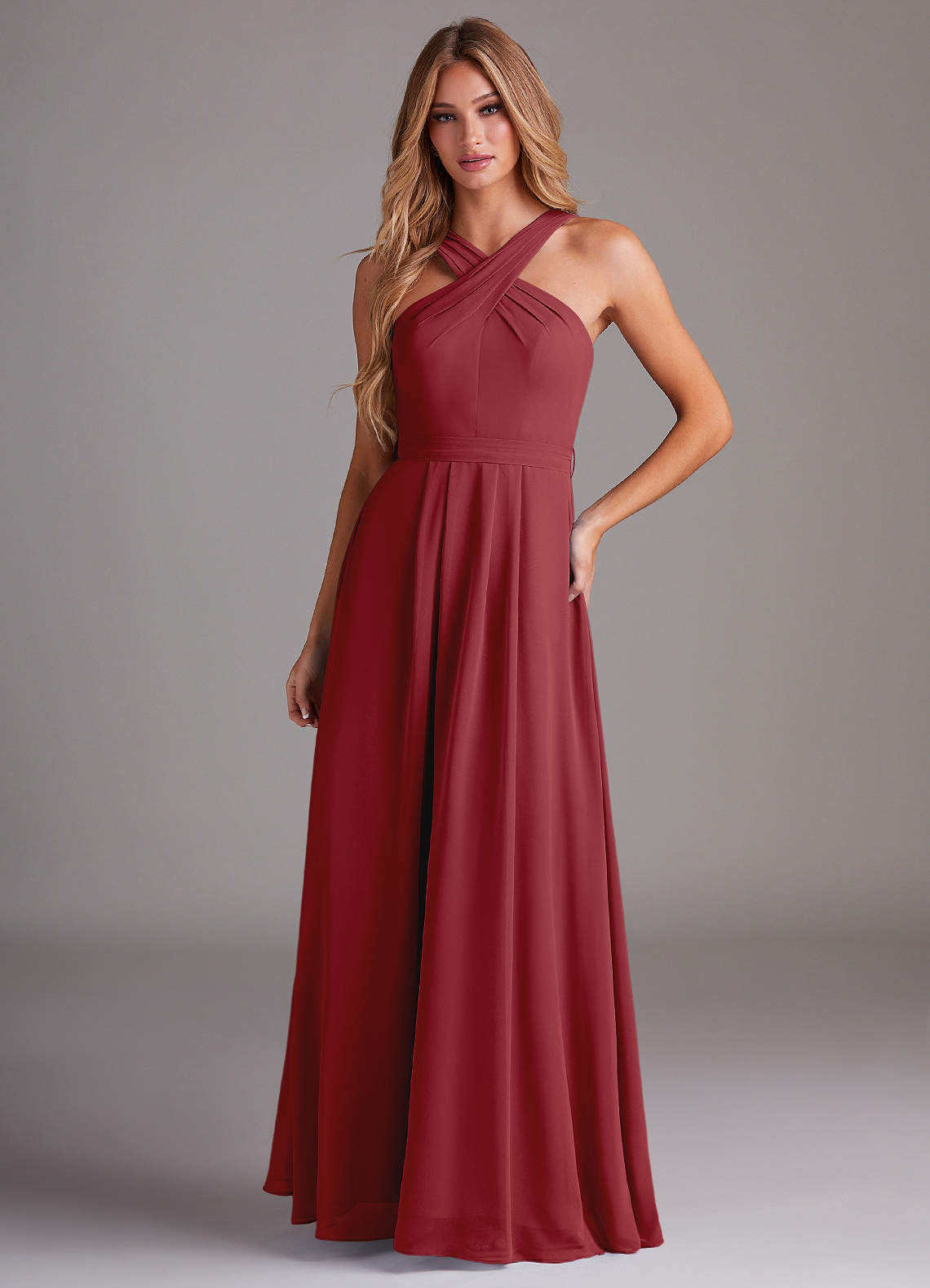 Pomegranate A-Line Halter Pleated Chiffon Dress