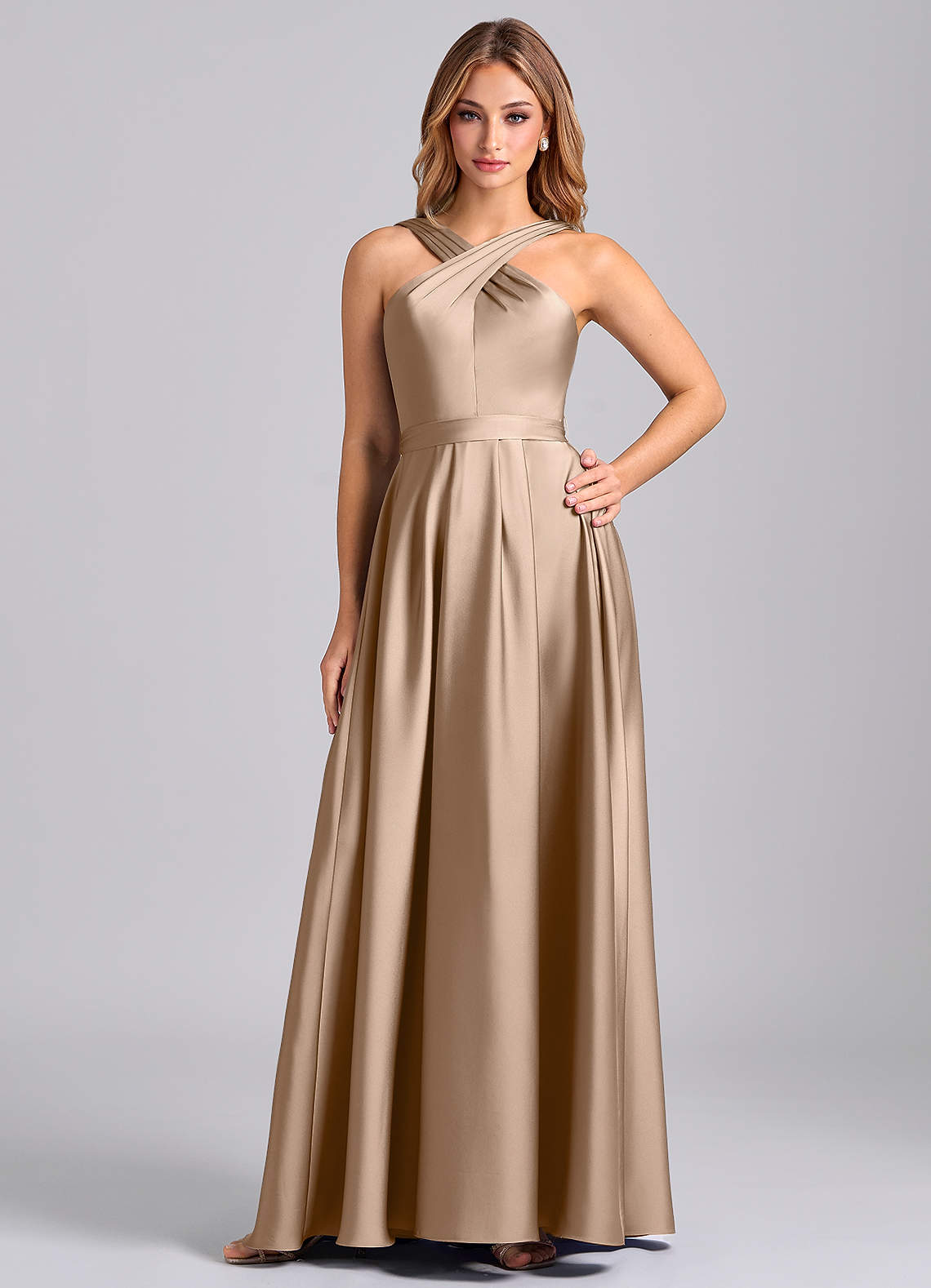 Taupe A-Line Pleated Stretch Satin Dress