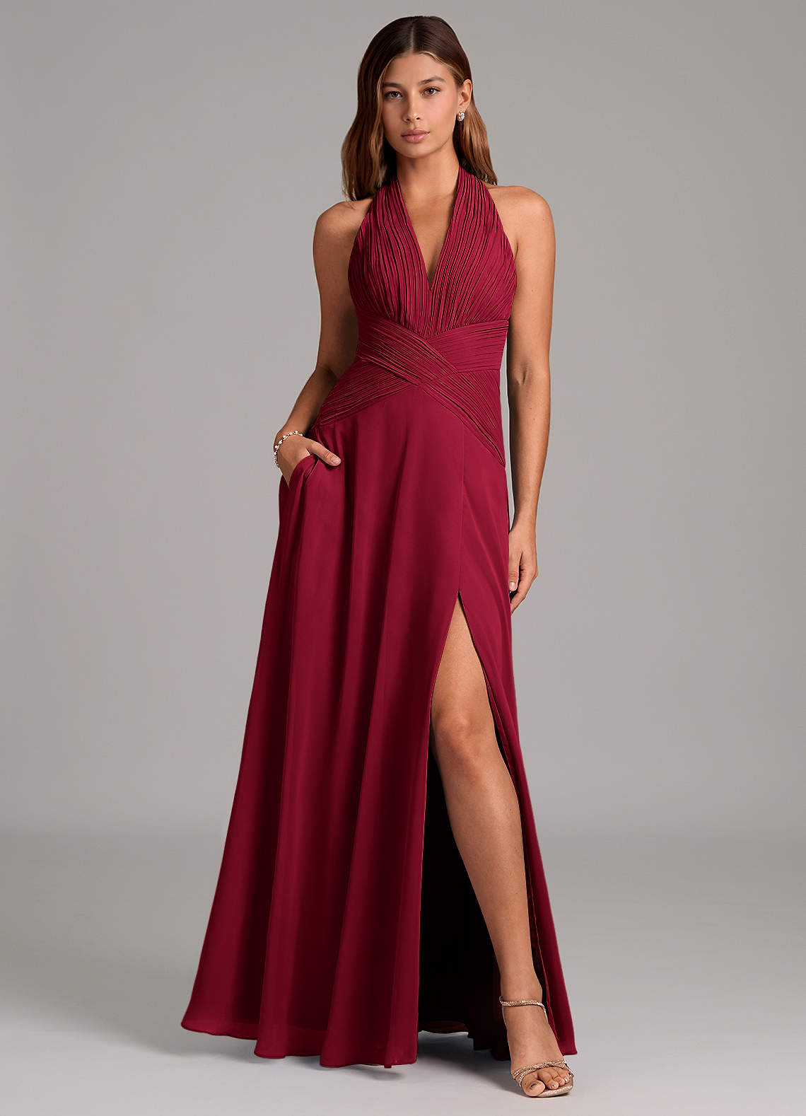 Burgundy A-Line Pleated Chiffon Dress