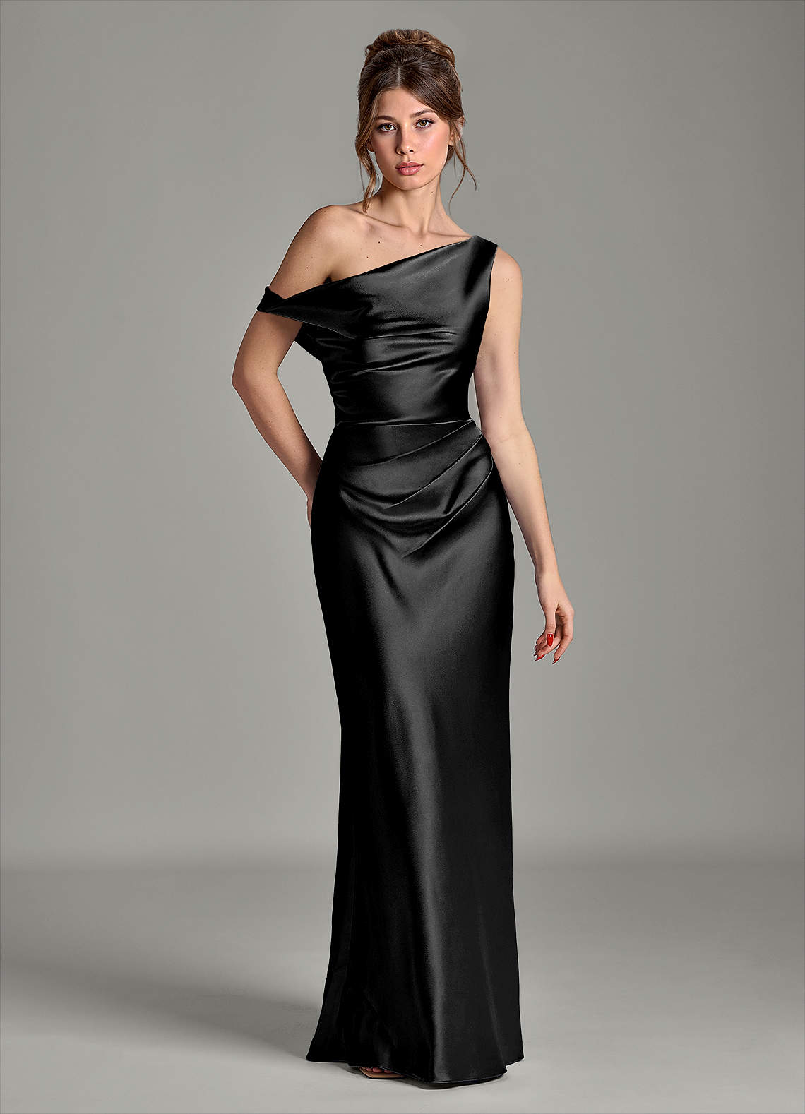 Azazie Emerson Bridesmaid Dresses Black Mermaid Off the Shoulder Metallic Satin Dress image1