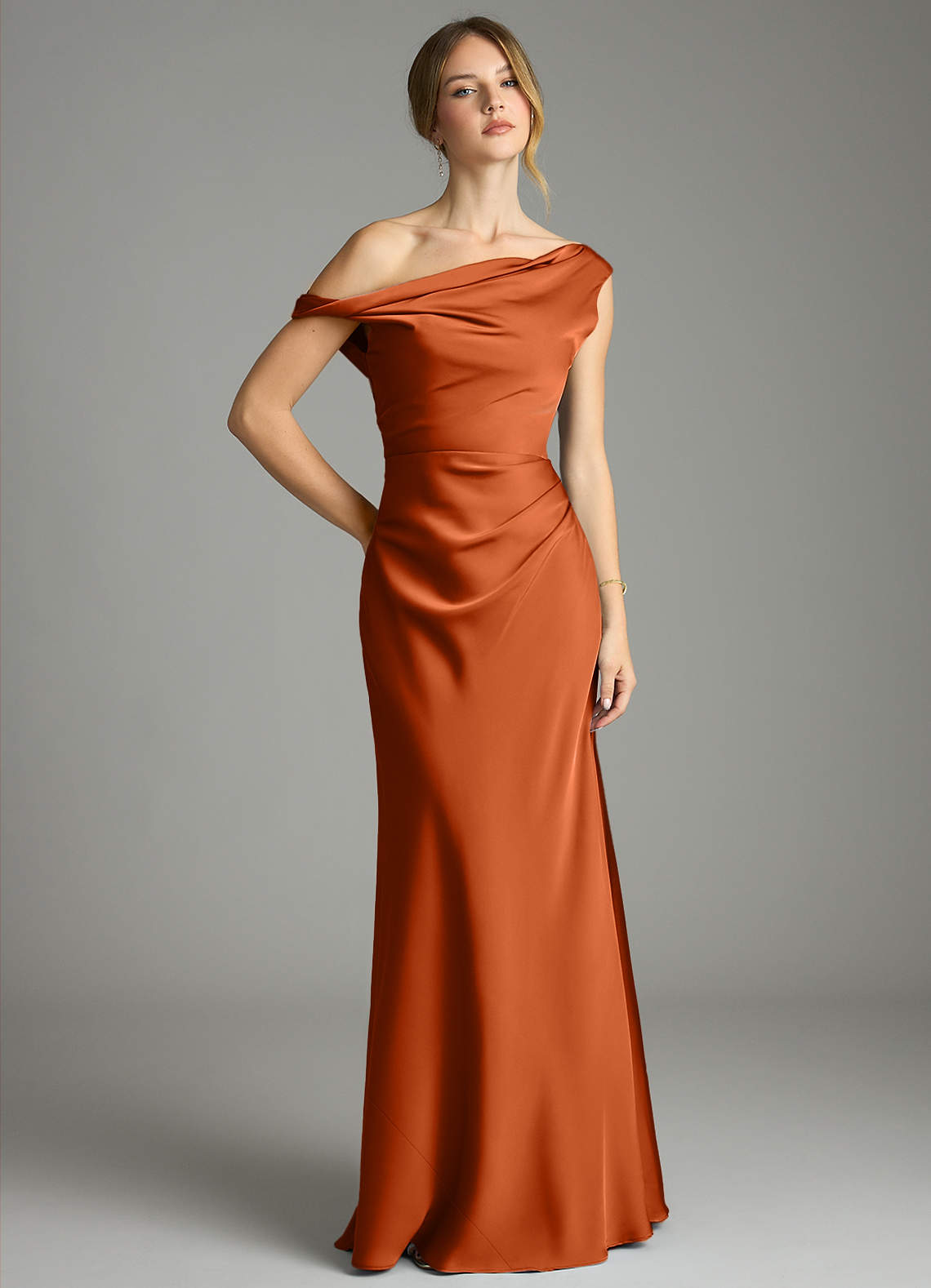 Burnt Orange Mermaid Off the Shoulder Stretch Satin Dress