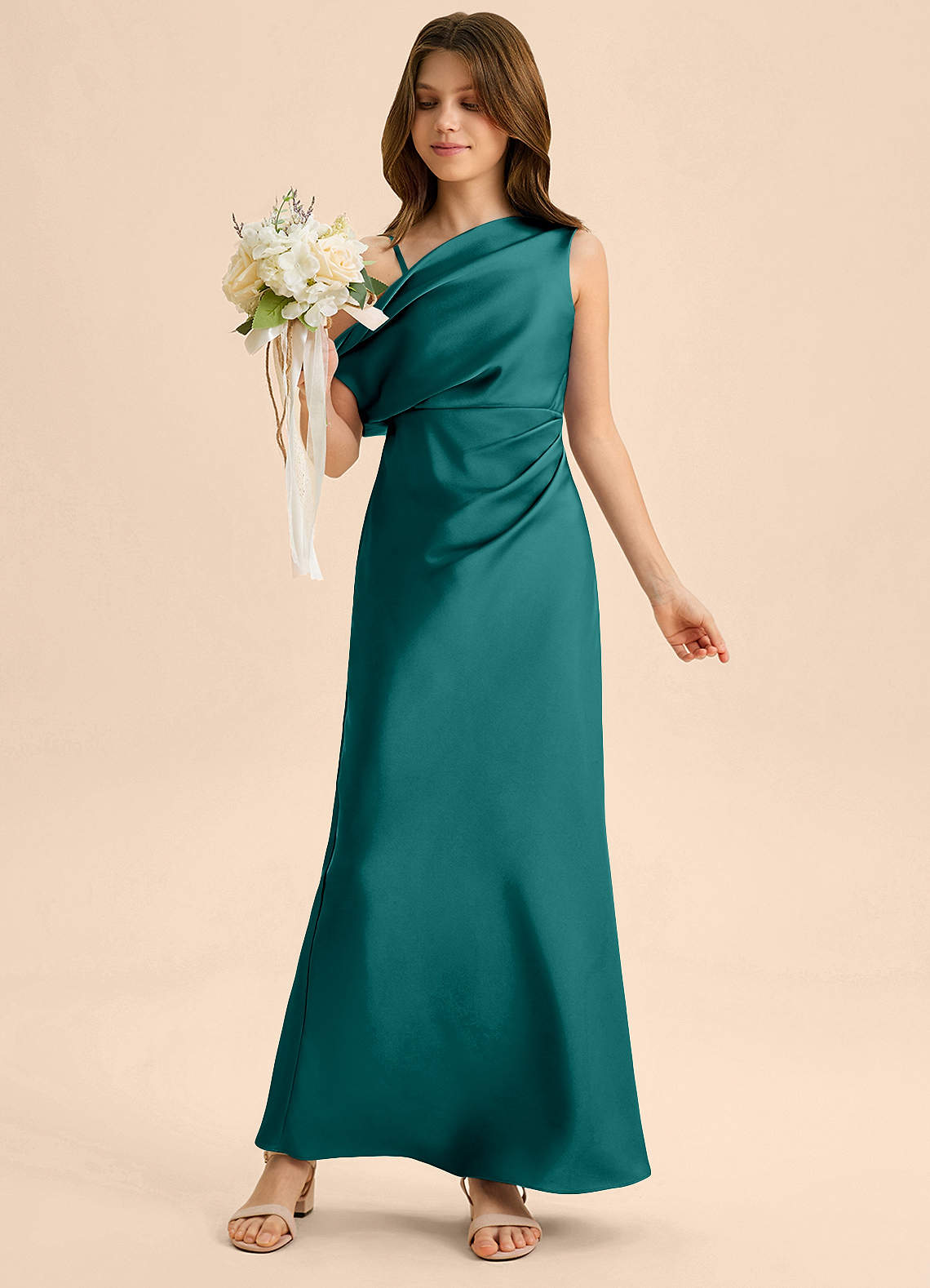 Peacock Sheath Off the Shoulder Stretch Satin Dress